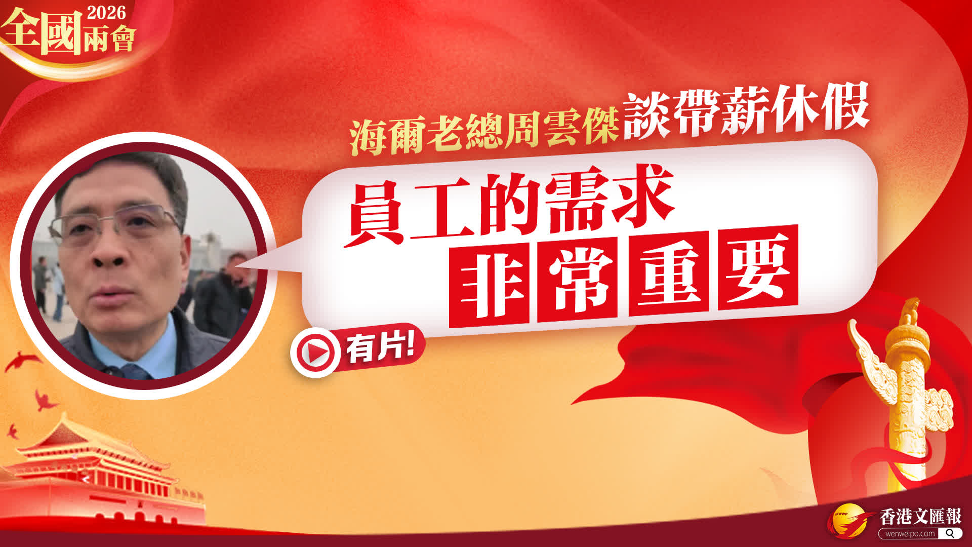 (香港文匯網記者 郭若溪)全國人大代表、海爾集團董事局主席、首席執行官周雲傑談帶薪休假時表示,員工的需求是非常重要的,只有員工滿意,才能為用戶創造價值。