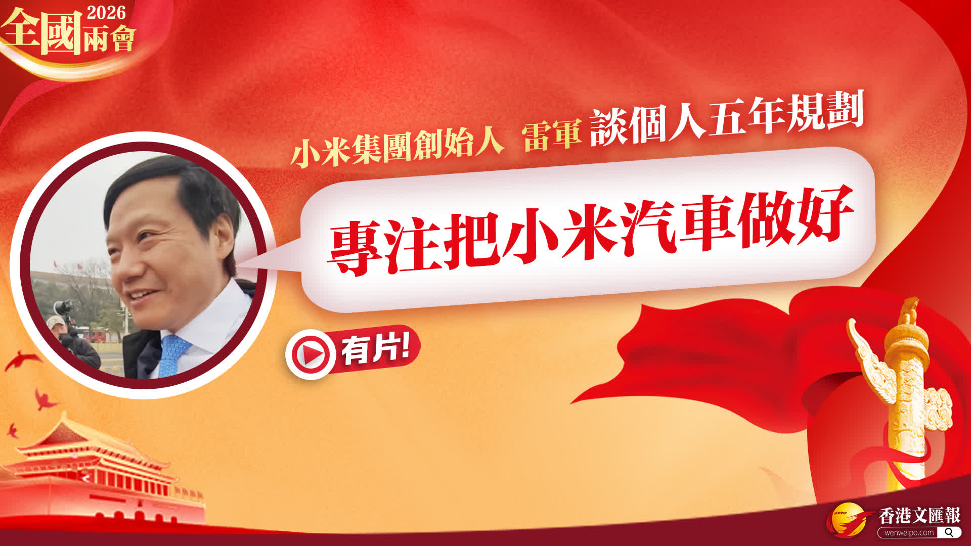 (香港文匯網記者 馬曉芳)十四屆全國人大四次會議將於今日(4日)12時在人民大會堂新聞發布廳舉行新聞發布會。全國人大代表、小米集團創始人雷軍接受文匯網記者採訪,回應了關於個人未來五年規劃的提問。雷軍表示,小米在機器人領域已深耕六年。談及未來發展重點,他表示:「接下來還是會專注把小米汽車做得更好。」