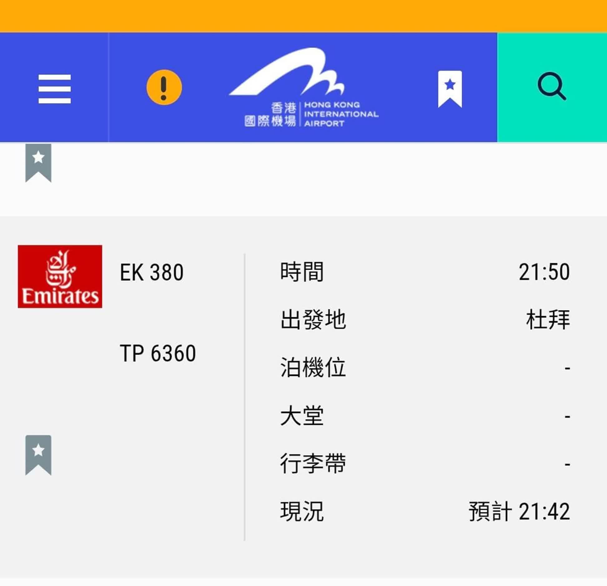 今日香港時間下午2時50分,由阿聯酋航空營運從迪拜返港的直航航班EK380已經起飛。該客機在當地早上10時40分出發,即香港下午2時40分,參考香港機場網頁,最快今晚香港時間近10時到港。