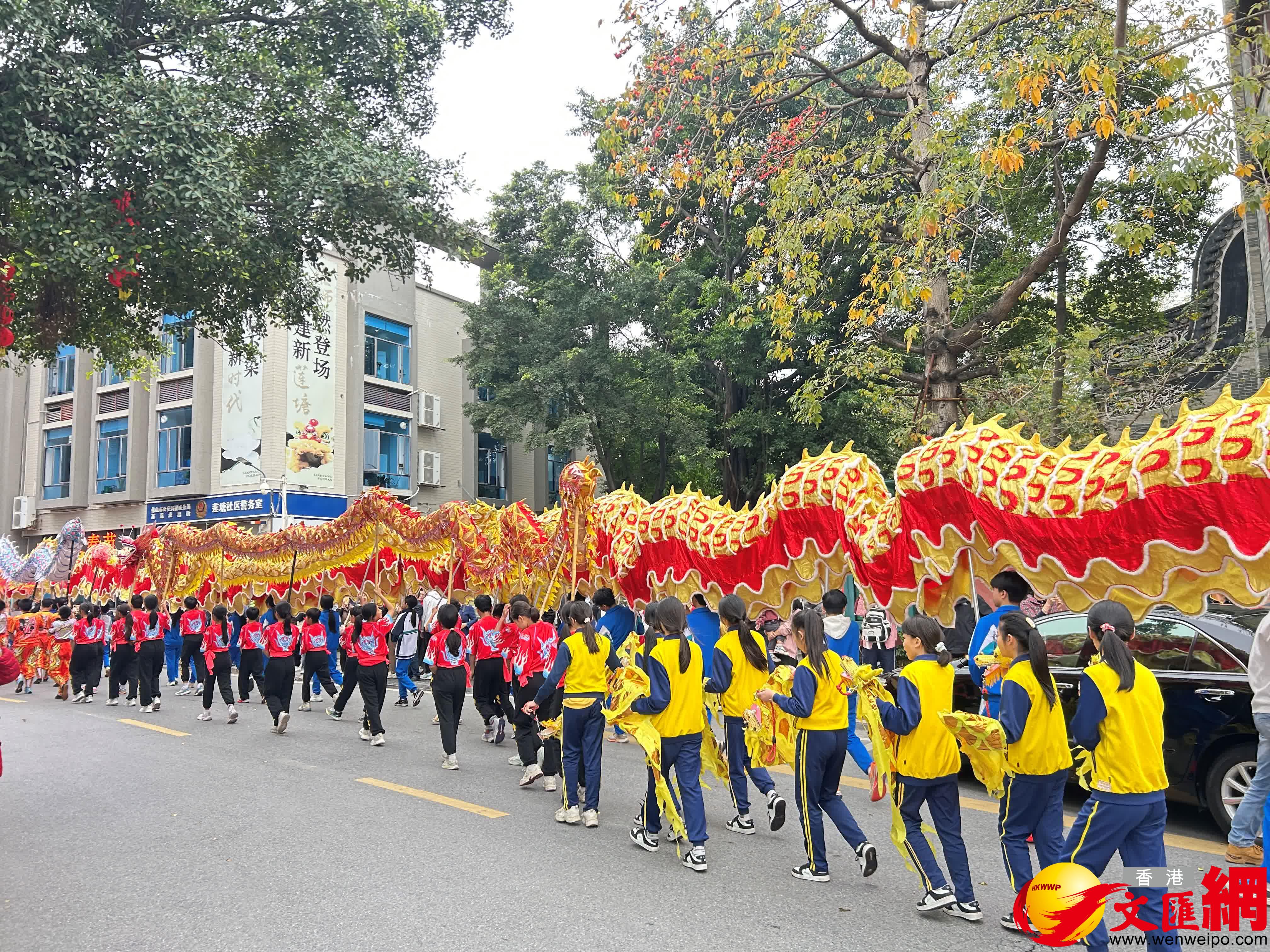 啟動儀式後,舉行了盛大的龍獅大巡遊,10餘個方陣依次出發,從村頭舞到商圈,場面震撼。當中,最吸睛的是由上百人共同舞動的108米大金龍,金色龍身在陽光下蜿蜒遊走,十分壯觀。