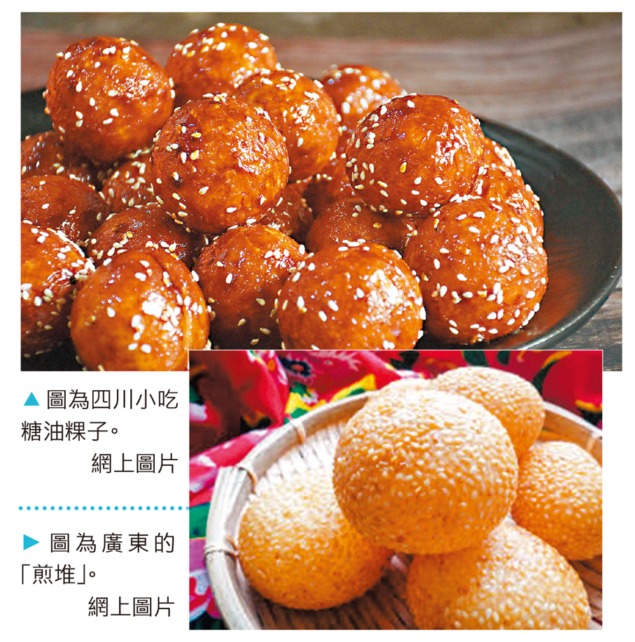 「油䭔」在現代的型態,除了接近川菜的「糖油粿子」,也像廣東的「煎堆」。這個「䭔」字,粵語發音應該是「堆」,加上二者的烹調方法極度相似,所以「煎堆」就是「煎䭔」。再者,「煎䭔」一說,早於唐代就有。例如唐王梵志有《粗行出家兒》一詩,寫到:「貪他油煎䭔,愛若波羅蜜」,這裏就有「煎䭔」的用例了。