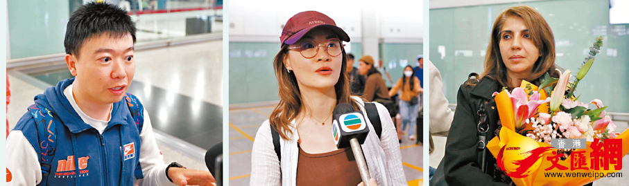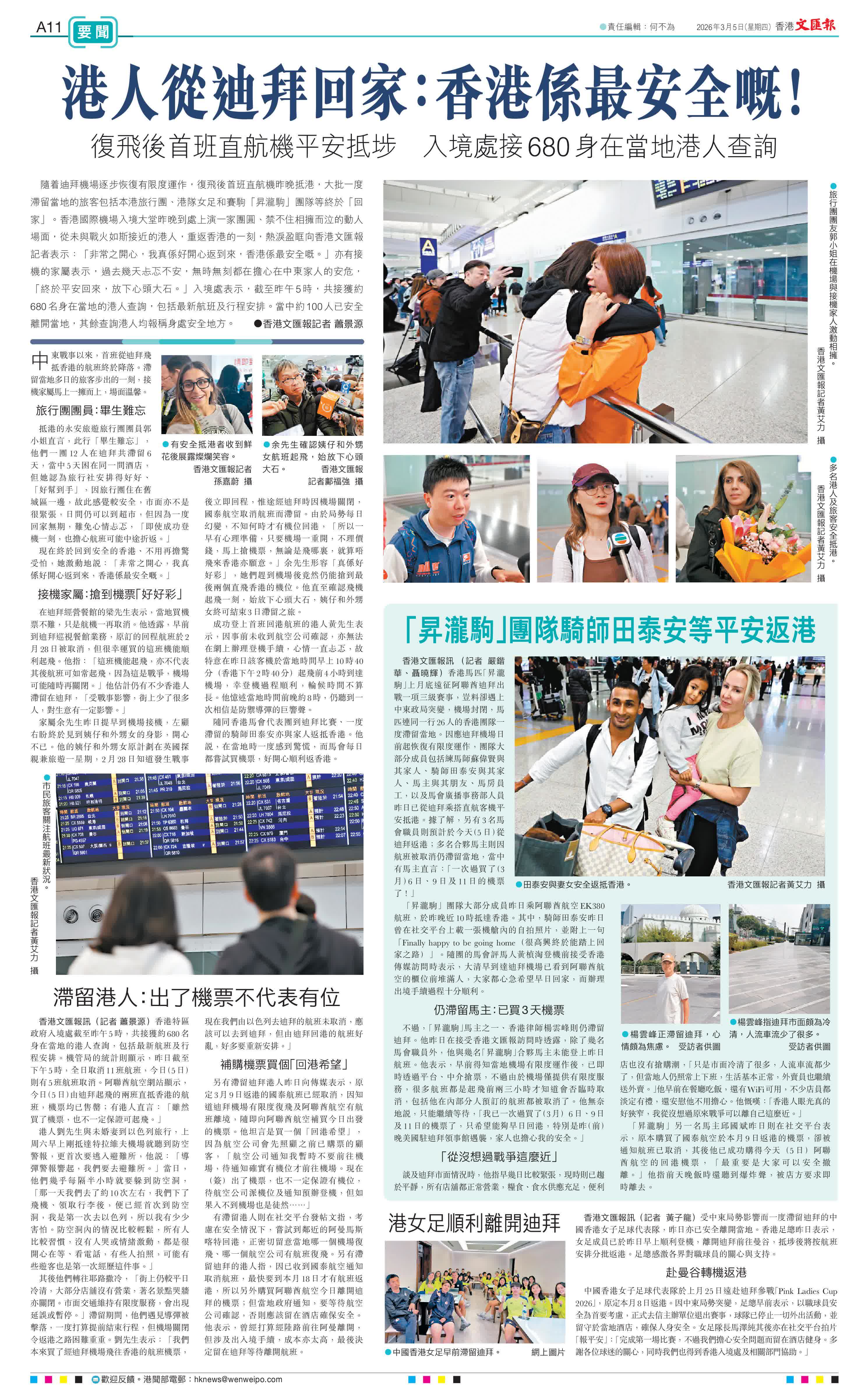 (香港文匯報記者 蕭景源)隨着迪拜機場逐步恢復有限度運作,復飛後首班直航機昨晚抵港,大批一度滯留當地的旅客包括本港旅行團、港隊女足和賽駒「昇瀧駒」團隊等終於「回家」。香港國際機場入境大堂昨晚到處上演一家團圓、禁不住相擁而泣的動人場面,從未與戰火如斯接近的港人,重返香港的一刻,熱淚盈眶向香港文匯報記者表示:「非常之開心,我真係好開心返到來,香港係最安全嘅。」亦有接機的家屬表示,過去幾天忐忑不安,無時無刻都在擔心在中東家人的安危,「終於平安回來,放下心頭大石。」入境處表示,截至昨午5時,共接獲約680名身在當地的港人查詢,包括最新航班及行程安排。當中約100人已安全離開當地,其餘查詢港人均報稱身處安全地方。