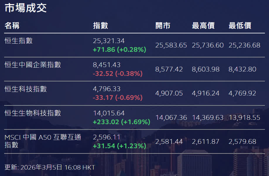 香港文匯報訊 經過連日跌勢,亞太區股市周四普遍反彈,港股整體表現亦回穩,惟三大指數走勢分化。恒生指數(恒指)早市一度明顯向上突玻,高見25,736點,隨後升幅收窄;收報25,321點,全日升71點或0.28%。國企指數跌0.38%。恒生科技指數跌0.69%。大市成交額約3,218.7億元,較周三約3,643億元低約11.6%。