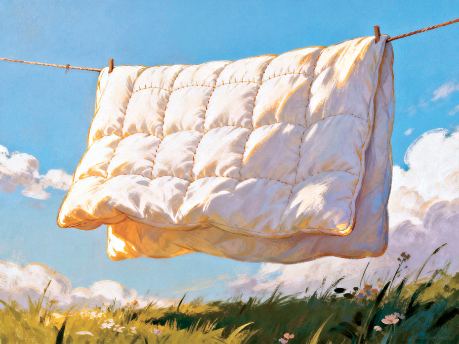 清晨推門下樓,樓道裏隱約飄着樟腦與棉絮混合的氣味。轉過樓梯角,一片晃眼的白驀地撲進眼簾——樓下空地的晾衣繩上,不知誰家的棉被正攤曬着,鼓脹脹的,像個吸飽了日光的暄騰騰大麵包。風過來時,被角微微掀動,便有極淡的、屬於陽光的乾燥香氣,和着被芯裏舊棉花的暖意,悠悠地散在空氣裏。