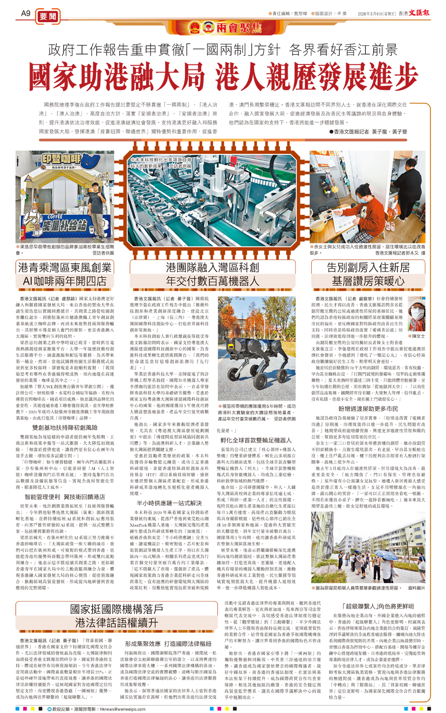 國務院總理李強在政府工作報告提出要堅定不移貫徹「一國兩制」、「港人治港」、「澳人治澳」、高度自治方針,落實「愛國者治港」、「愛國者治澳」原則,提升港澳依法治理效能,促進港澳經濟社會發展。支持港澳更好融入和服務國家發展大局,發揮港澳「背靠祖國、聯通世界」獨特優勢和重要作用,促進香港、澳門長期繁榮穩定。香港文匯報訪問不同界別人士,就香港在深化國際交往合作、融入國家發展大局、促進經濟發展及改善民生等議題的現況與自身體驗,他們認為在國家的支持下,香港將能進一步穩健發展。
