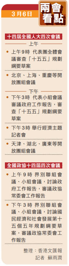 (香港文匯報記者 馬靜 兩會報道)會議審查《中華人民共和國國民經濟和社會發展第十五個五年規劃綱要(草案)》,規劃綱要草案第十七篇《堅持和完善「一國兩制」 推進祖國統一》再設「促進香港、澳門長期繁榮穩定」港澳專章,提出要支持港澳鞏固提升競爭優勢,支持港澳更好融入和服務國家發展大局。綱要草案提出支持香港構建大宗商品交易生態圈和高增值供應鏈服務中心。支持香港建設國際創新科技中心,深化國際法律及解決爭議服務中心、區域知識產權貿易中心、中外文化藝術交流中心建設,加快北部都會區建設。建設廣州至珠海(澳門)高鐵,推進港深西部鐵路前期工作。