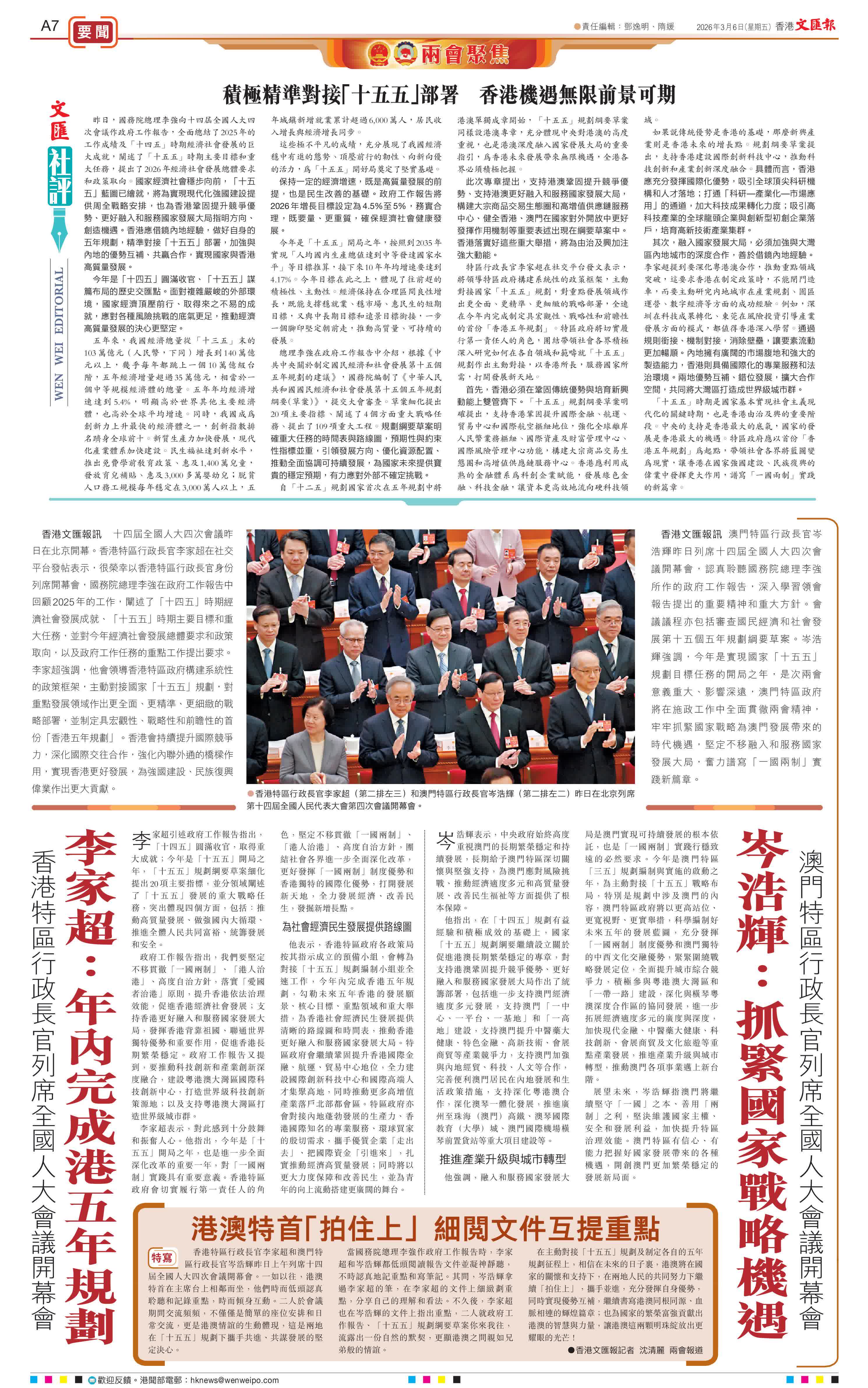 香港文匯報訊 十四屆全國人大四次會議昨日在北京開幕。香港特區行政長官李家超在社交平台發帖表示,很榮幸以香港特區行政長官身份列席開幕會,國務院總理李強在政府工作報告中回顧2025年的工作,闡述了「十四五」時期經濟社會發展成就、「十五五」時期主要目標和重大任務,並對今年經濟社會發展總體要求和政策取向,以及政府工作任務的重點工作提出要求。李家超強調,他會領導香港特區政府構建系統性的政策框架,主動對接國家「十五五」規劃,對重點發展領域作出更全面、更精準、更細緻的戰略部署,並制定具宏觀性、戰略性和前瞻性的首份「香港五年規劃」。香港會持續提升國際競爭力,深化國際交往合作,強化內聯外通的橋樑作用,實現香港更好發展,為強國建設、民族復興偉業作出更大貢獻。