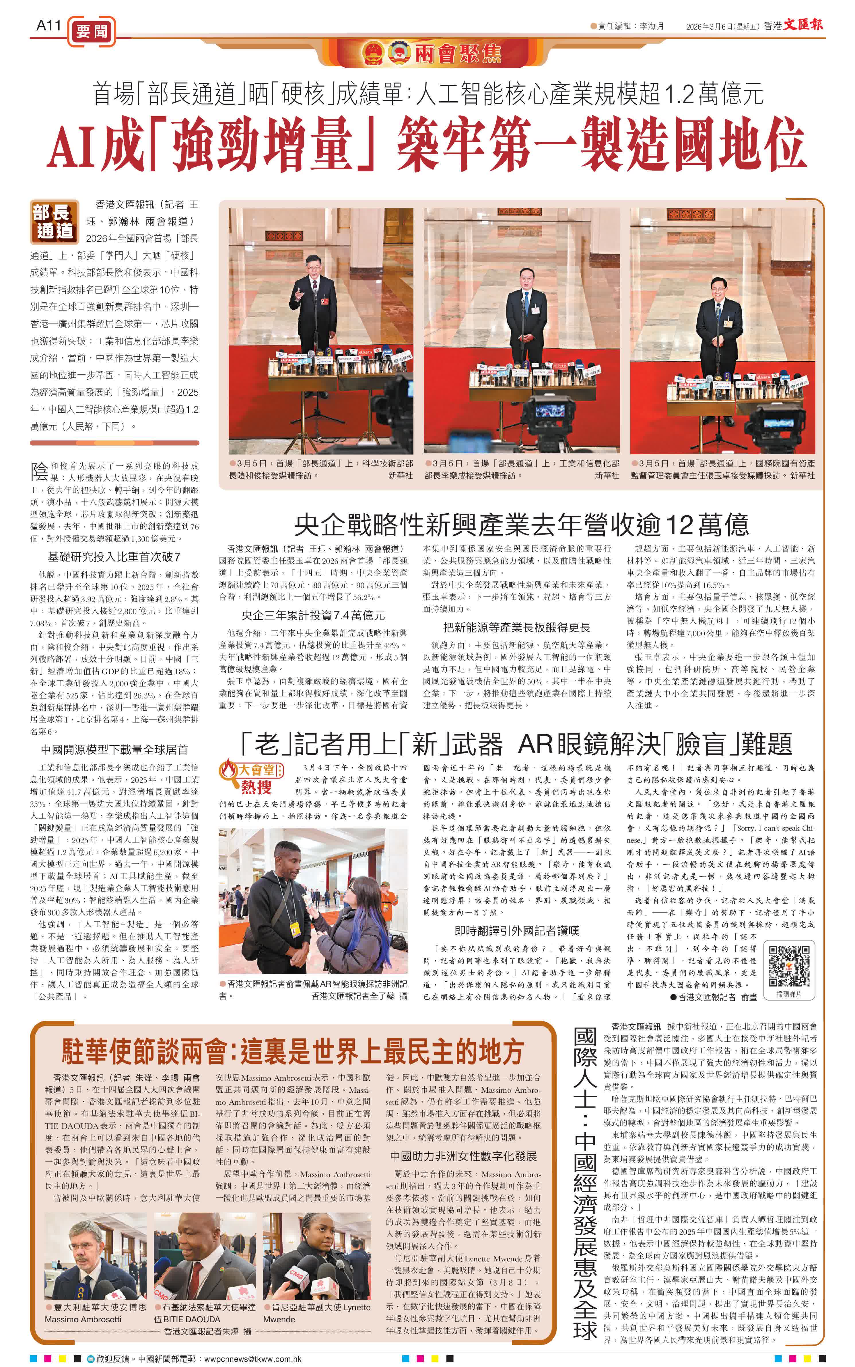 香港文匯報訊(記者 王珏、郭瀚林 兩會報道)2026年全國兩會首場「部長通道」上,部委「掌門人」大晒「硬核」成績單。科技部部長陰和俊表示,中國科技創新指數排名已躍升至全球第10位,特別是在全球百強創新集群排名中,深圳—香港—廣州集群躍居全球第一,芯片攻關也獲得新突破;工業和信息化部部長李樂成介紹,當前,中國作為世界第一製造大國的地位進一步鞏固,同時人工智能正成為經濟高質量發展的「強勁增量」,2025年,中國人工智能核心產業規模已超過1.2萬億元(人民幣,下同)。