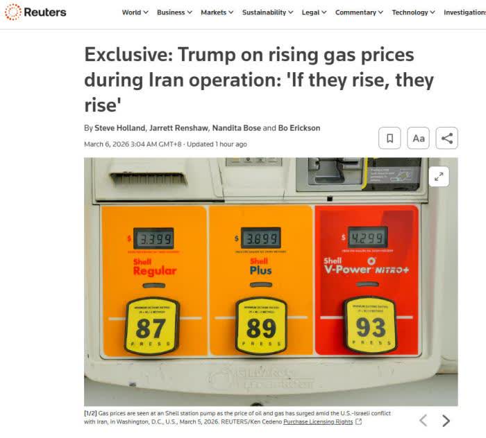特朗普稱,「我對此毫不擔心,危機結束後,油價會迅速下跌。它(油價)要漲就漲吧,(軍事行動)遠比油價小幅上漲重要得多。」