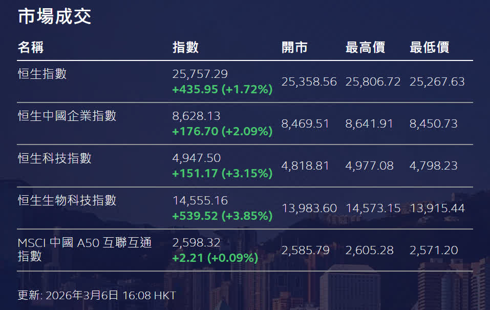 香港文匯報訊 港股整體呈反彈,三大指數齊高收。恒生指數(恒指)收報25,757點,升435點或1.72%;國企指數升2.09%;恒生科技指數升3.15%。大市成交約2,928億元,較周四的3,218.7億元進一步減少。