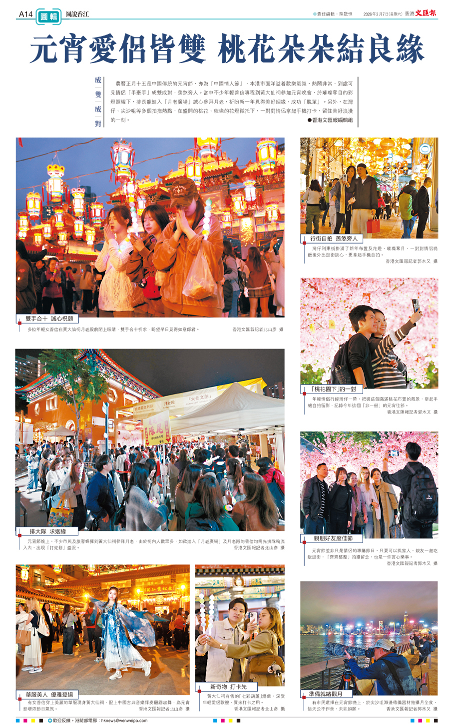 農曆正月十五是中國傳統的元宵節,亦為「中國情人節」,本港市面洋溢着歡樂氣氛,熱鬧非常,到處可見情侶「手牽手」成雙成對,羨煞旁人。當中不少年輕善信專程到黃大仙祠參加元宵晚會,於璀璨奪目的彩燈照耀下,排長龍進入「月老廣場」誠心參拜月老,祈盼新一年覓得美好姻緣,成功「脫單」。另外,在灣仔、尖沙咀等多個拍拖熱點,在盛開的桃花、璀璨的花燈襯托下,一對對情侶拿起手機打卡,留住美好浪漫的一刻。 ●香港文匯報編輯組