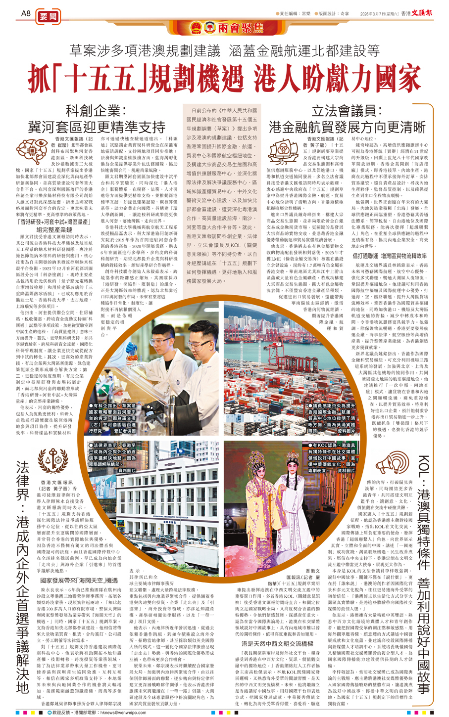 日前公布的《中華人民共和國國民經濟和社會發展第十五個五年規劃綱要(草案)》提出多項涉及港澳的規劃建議,包括支持香港鞏固提升國際金融、航運、貿易中心和國際航空樞紐地位,及構建大宗商品交易生態圈和高增值供應鏈服務中心,並深化國際法律及解決爭議服務中心、區域知識產權貿易中心、中外文化藝術交流中心建設,以及加快北部都會區建設,還要深化粵港澳合作,高質量建設前海、南沙、河套等重大合作平台等。就此,香港文匯報訪問科創企業、法律界、立法會議員及KOL(關鍵意見領袖)等不同持份者,以自身經歷講述在「十五五」規劃下如何發揮機遇,更好地融入和服務國家發展大局。