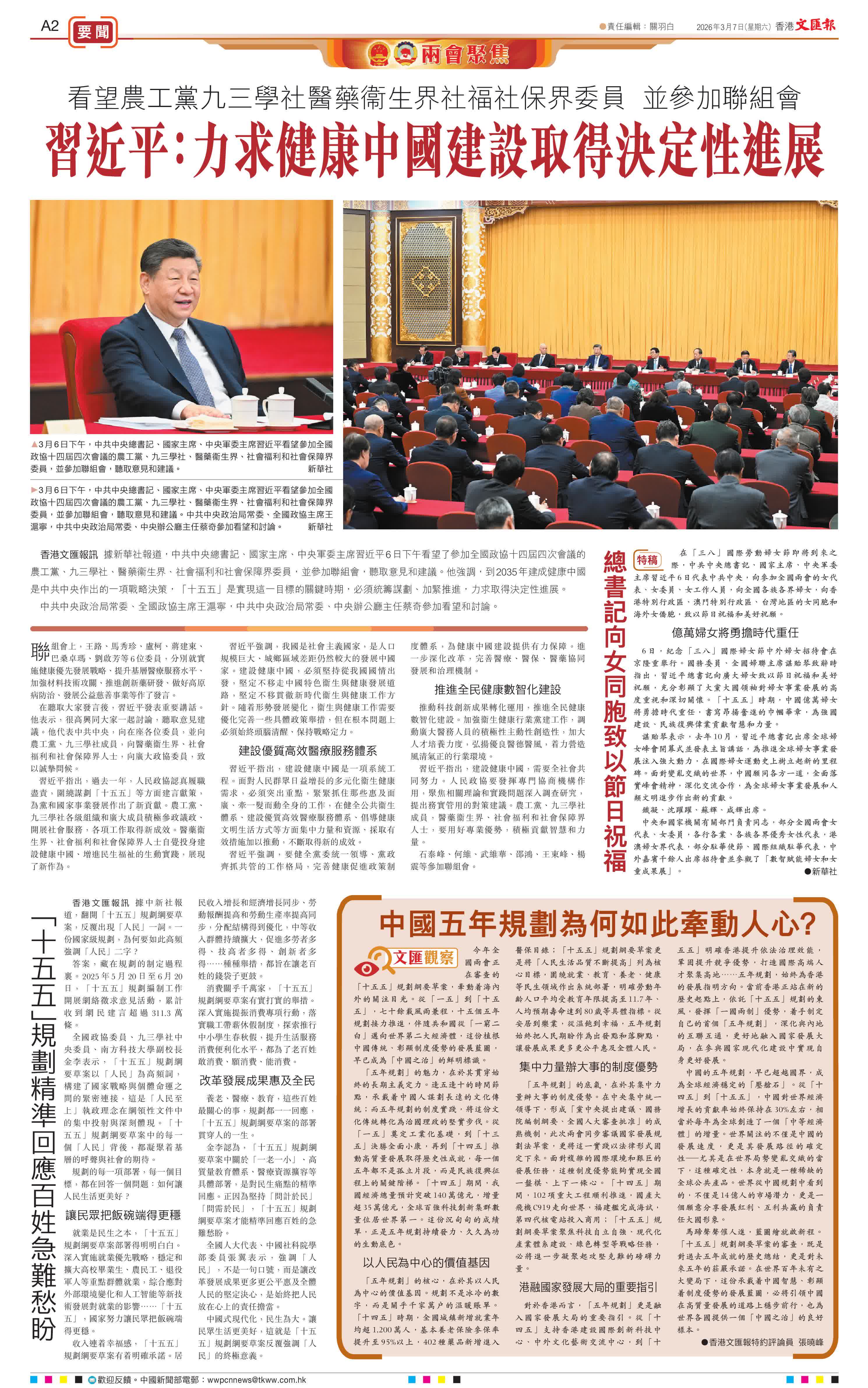 香港文匯報訊 據新華社報道,中共中央總書記、國家主席、中央軍委主席習近平6日下午看望了參加全國政協十四屆四次會議的農工黨、九三學社、醫藥衞生界、社會福利和社會保障界委員,並參加聯組會,聽取意見和建議。他強調,到2035年建成健康中國是中共中央作出的一項戰略決策,「十五五」是實現這一目標的關鍵時期,必須統籌謀劃、加緊推進,力求取得決定性進展。