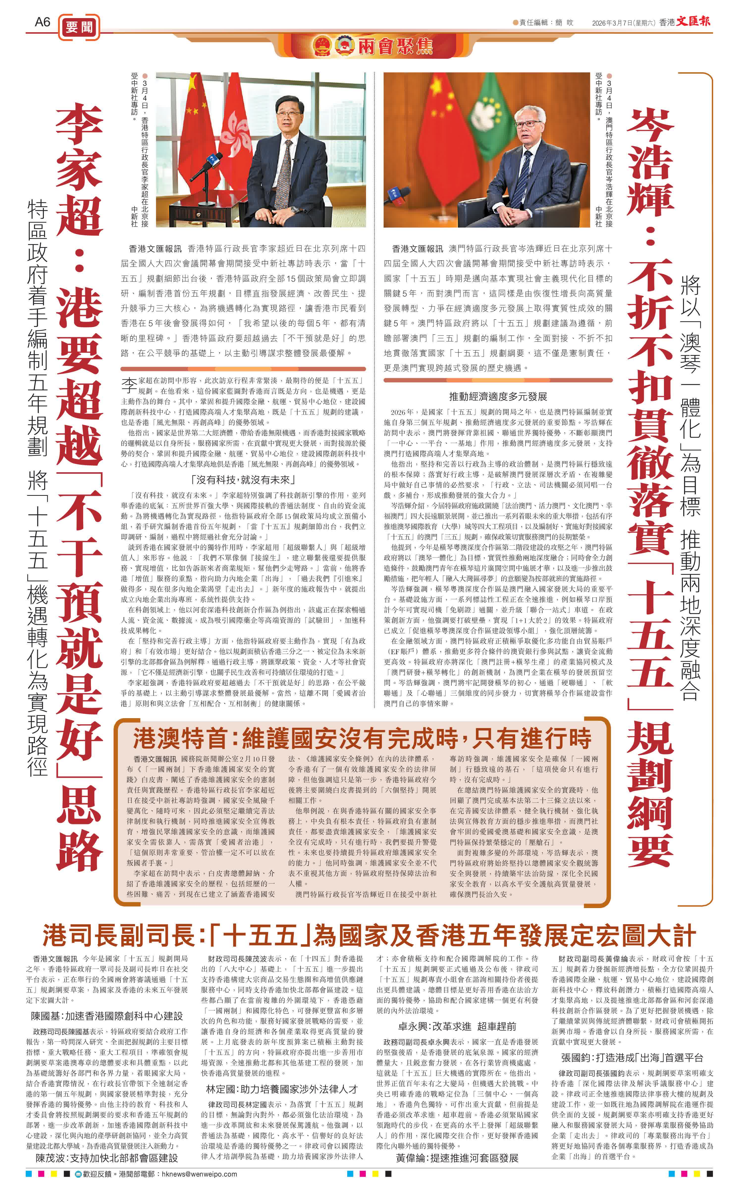 澳門特區行政長官岑浩輝近日在北京列席十四屆全國人大四次會議開幕會期間接受中新社專訪時表示,國家「十五五」時期是邁向基本實現社會主義現代化目標的關鍵5年,而對澳門而言,這同樣是由恢復性增長向高質量發展轉型、力爭在經濟適度多元發展上取得實質性成效的關鍵5年。澳門特區政府將以「十五五」規劃建議為遵循,前瞻部署澳門「三五」規劃的編制工作,全面對接、不折不扣地貫徹落實國家「十五五」規劃綱要,這不僅是憲制責任,更是澳門實現跨越式發展的歷史機遇。