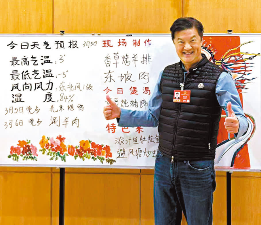 他說,每日的菜式都沒有重複,讓代表們吃到多元化的佳餚,享受美食帶來的快樂和滿足。飯店更有一項超貼心安排:大堂專設告示板,每日同步預告天氣與當日菜式,代表們出門開會前,就能清楚知道當天用餐菜單,甚有儀式感,也有滿滿的期待。 ●香港文匯報記者 嚴少阡 兩會報道