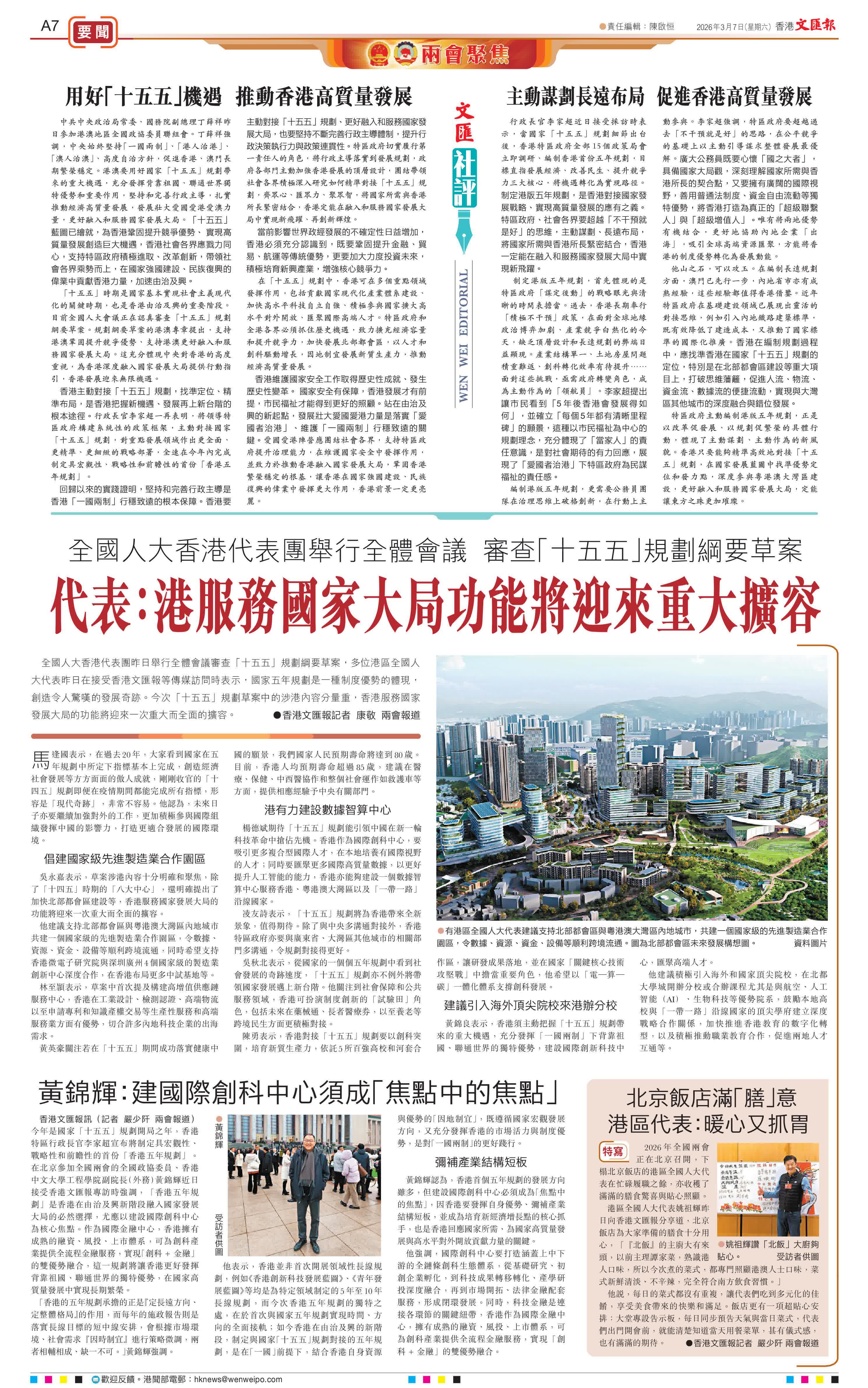黃錦輝認為,香港首個五年規劃的發展方向雖多,但建設國際創科中心必須成為「焦點中的焦點」,因香港要發揮自身優勢、彌補產業結構短板,並成為培育新經濟增長點的核心抓手,也是香港回應國家所需、為國家高質量發展與高水平對外開放貢獻力量的關鍵。
