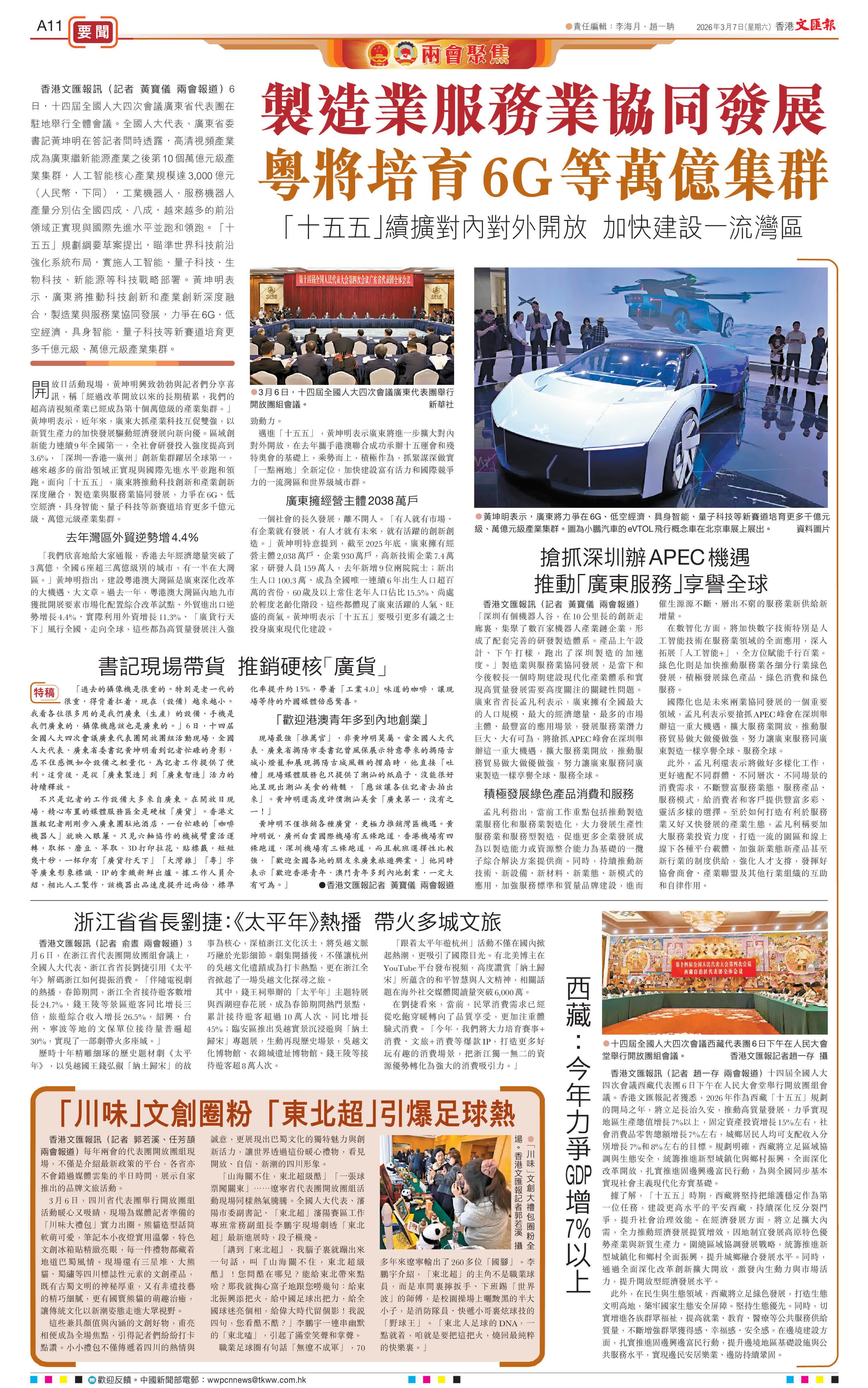 香港文匯報訊(記者 黃寶儀 兩會報道)6日,十四屆全國人大四次會議廣東省代表團在駐地舉行全體會議。全國人大代表、廣東省委書記黃坤明在答記者問時透露,高清視頻產業成為廣東繼新能源產業之後第10個萬億元級產業集群,人工智能核心產業規模達3,000億元(人民幣,下同),工業機器人、服務機器人產量分別佔全國四成、八成,越來越多的前沿領域正實現與國際先進水平並跑和領跑。「十五五」規劃綱要草案提出,瞄準世界科技前沿強化系統布局,實施人工智能、量子科技、生物科技、新能源等科技戰略部署。黃坤明表示,廣東將推動科技創新和產業創新深度融合,製造業與服務業協同發展,力爭在6G、低空經濟、具身智能、量子科技等新賽道培育更多千億元級、萬億元級產業集群。