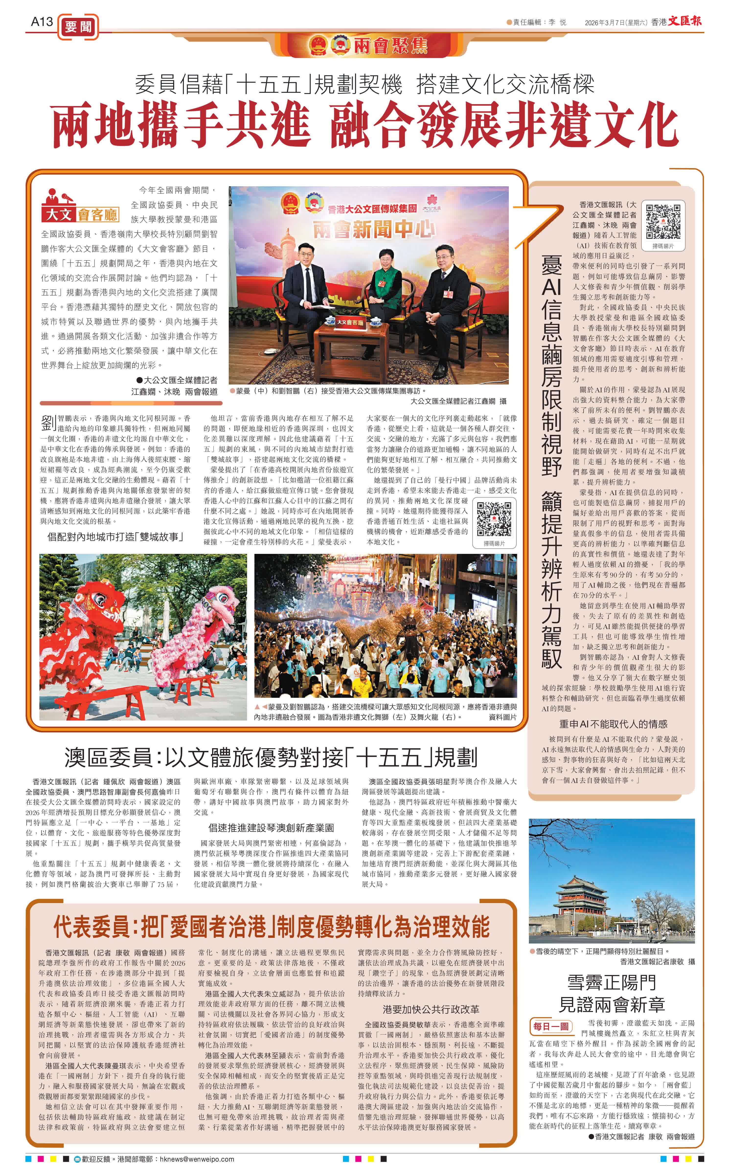 今年全國兩會期間,全國政協委員、中央民族大學教授蒙曼和港區全國政協委員、香港嶺南大學校長特別顧問劉智鵬作客大公文匯全媒體的《大文會客廳》節目,圍繞「十五五」規劃開局之年,香港與內地在文化領域的交流合作展開討論。他們均認為,「十五五」規劃為香港與內地的文化交流搭建了廣闊平台。香港憑藉其獨特的歷史文化、開放包容的城市特質以及聯通世界的優勢,與內地攜手共進。通過開展各類文化活動、加強非遺合作等方式,必將推動兩地文化繁榮發展,讓中華文化在世界舞台上綻放更加絢爛的光彩。