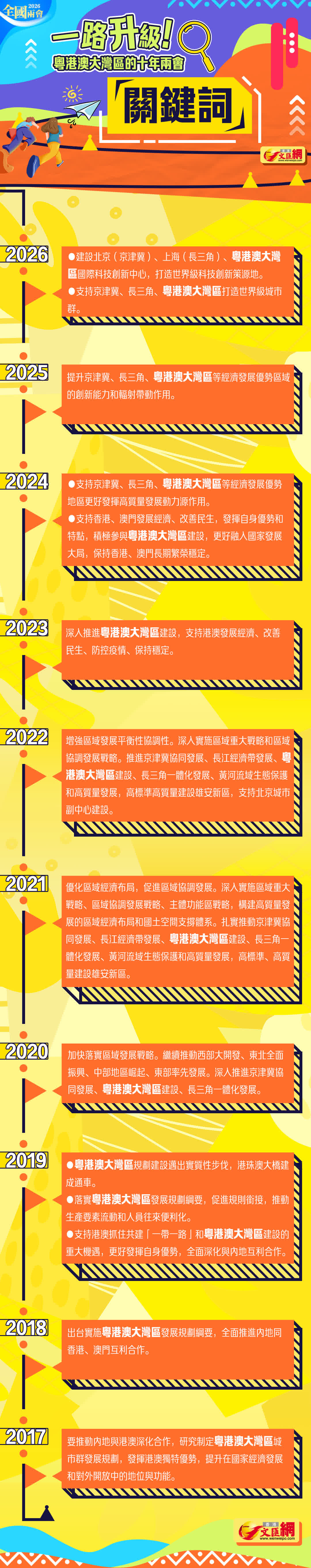 從2017年首次寫入全國兩會政府工作報告,粵港澳大灣區已連續十年被納入國家重點工作部署。這十年政府工作報告,體現了黨和國家對大灣區的深厚寄望和殷切關注,見證了大灣區的發展與成長,更為大灣區的未來道路指明方向。今天,讓我們通過一張長圖回顧這十年政府工作報告中的「粵港澳大灣區」。