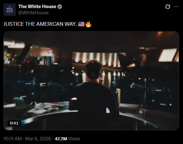 美國白宮6日在社交媒體平台X發布一段混剪視頻,把好萊塢電影、電子遊戲片段與美軍近期打擊伊朗軍事行動的畫面拼接在一起。視頻迅速引發爭議,遭到電影業人士指責。