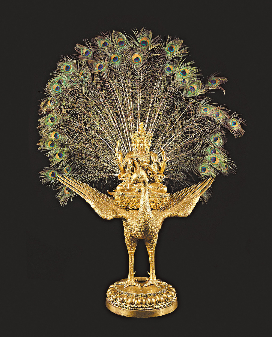 「永宣金銅造像」與「宣德爐」是明代工藝美術的傑出代表,其創新的藝術形式對後世影響深遠。「永宣垂範、震古耀今」單元展出了大都會藝術博物館藏明永樂鐵鋄金銀天杖、柏林民族學博物館藏明宣德銅鎏金孔雀明王像、青海省博物館藏明宣德賜瞿曇寺鎏金銅瓶等作品。孔雀明王在中土佛教中為消災除毒之本尊,此密教造像融合漢藏元素:孔雀明王三面六臂,騎孔雀狀。精湛的寶冠瓔珞鏨刻與孔雀翎毛寫實刻畫,彰顯明代鑄銅巔峰技藝。