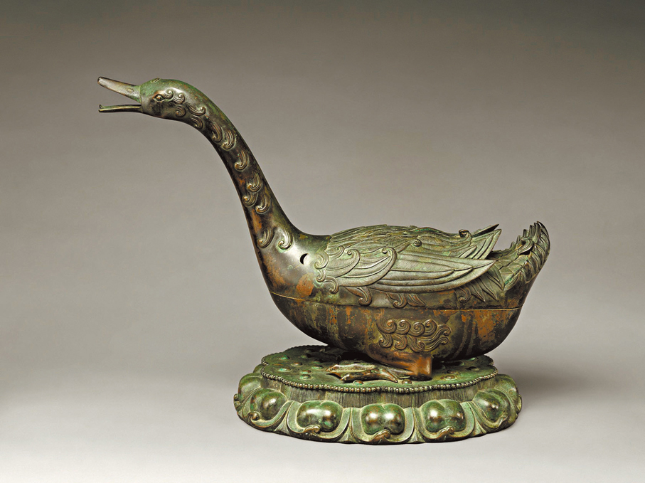 大都會藝術博物館藏明代雁形銅熏爐鑄工精湛,肌理寫實,彰顯明初審美新趨。香煙可自嘴喙徐徐吐出,巧妙融合了自然主義、裝飾細節與歷史追慕——其造型既呼應漢代原型,亦復興了13世紀至14世紀的仿古傳統,終成明代銅器藝術之巔。