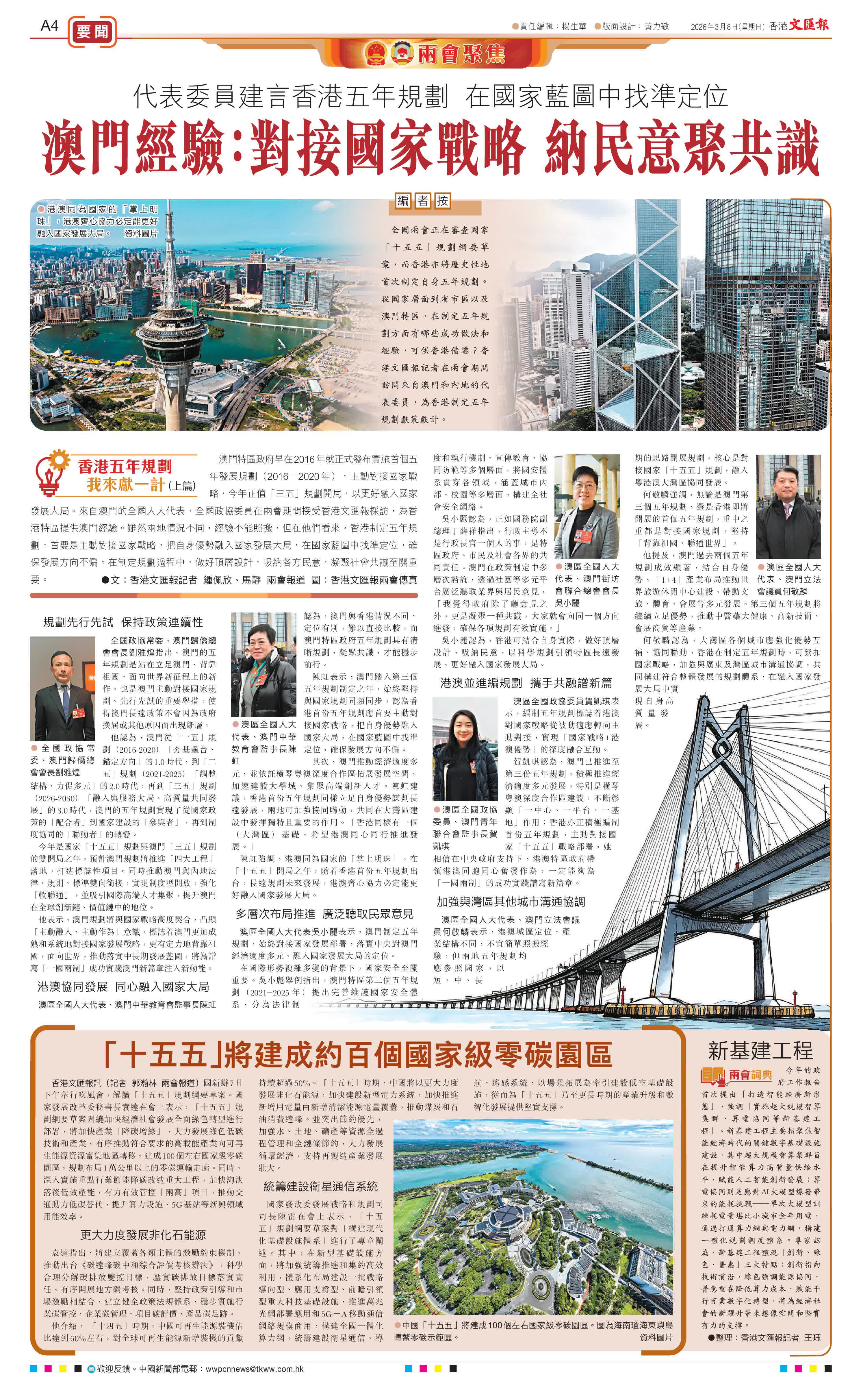 編者按:全國兩會正在審查國家「十五五」規劃綱要草案,而香港亦將歷史性地首次制定自身五年規劃。從國家層面到省市區以及澳門特區,在制定五年規劃方面有哪些成功做法和經驗,可供香港借鑒?香港文匯報記者在兩會期間訪問來自澳門和內地的代表委員,為香港制定五年規劃獻策獻計。