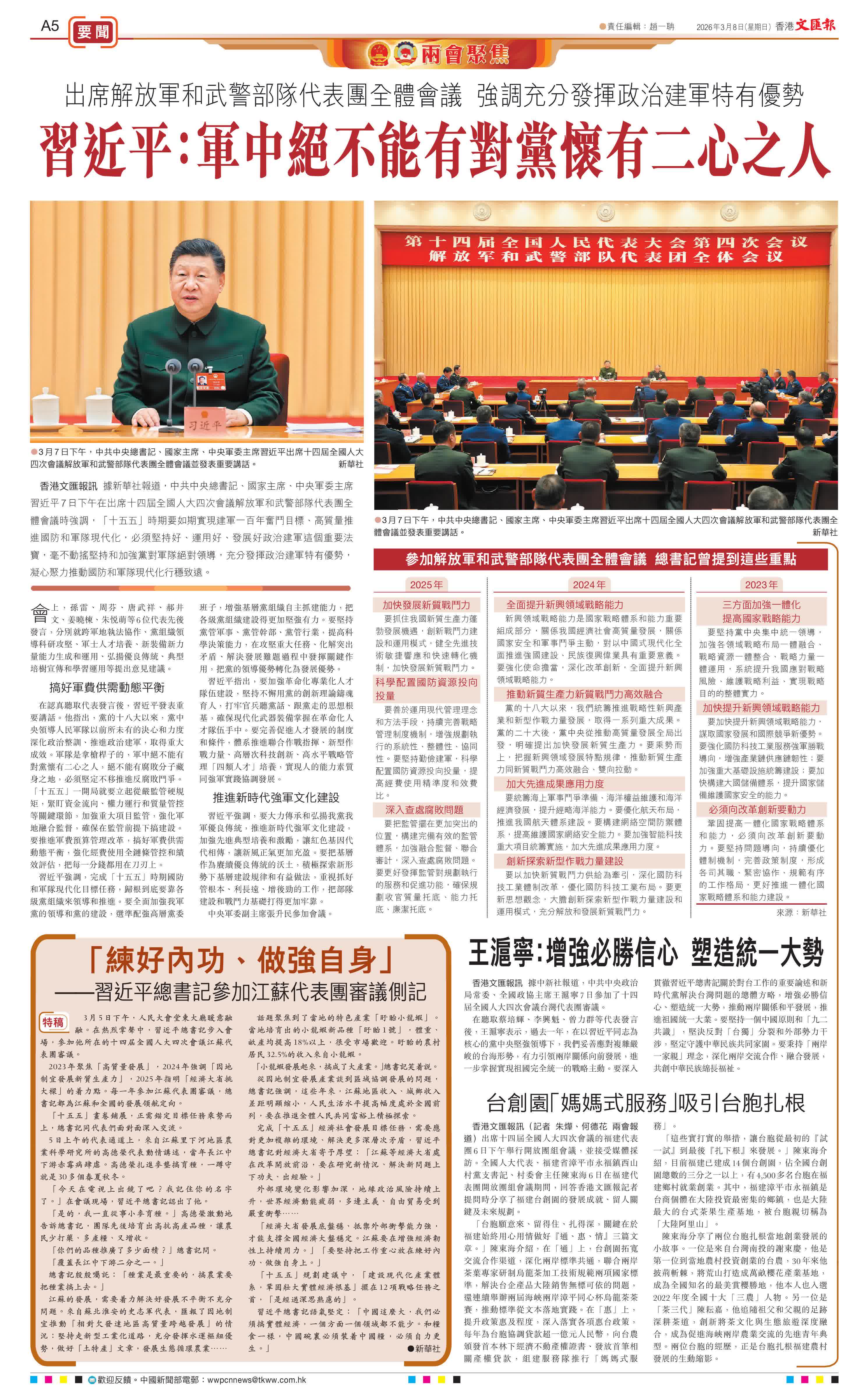香港文匯報訊 據新華社報道,中共中央總書記、國家主席、中央軍委主席習近平7日下午在出席十四屆全國人大四次會議解放軍和武警部隊代表團全體會議時強調,「十五五」時期要如期實現建軍一百年奮鬥目標、高質量推進國防和軍隊現代化,必須堅持好、運用好、發展好政治建軍這個重要法寶,毫不動搖堅持和加強黨對軍隊絕對領導,充分發揮政治建軍特有優勢,凝心聚力推動國防和軍隊現代化行穩致遠。