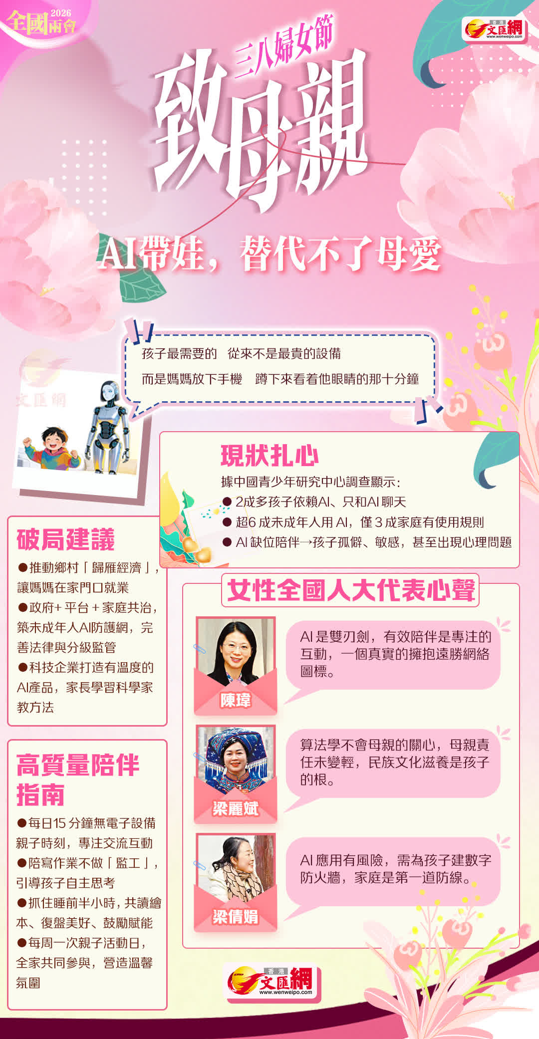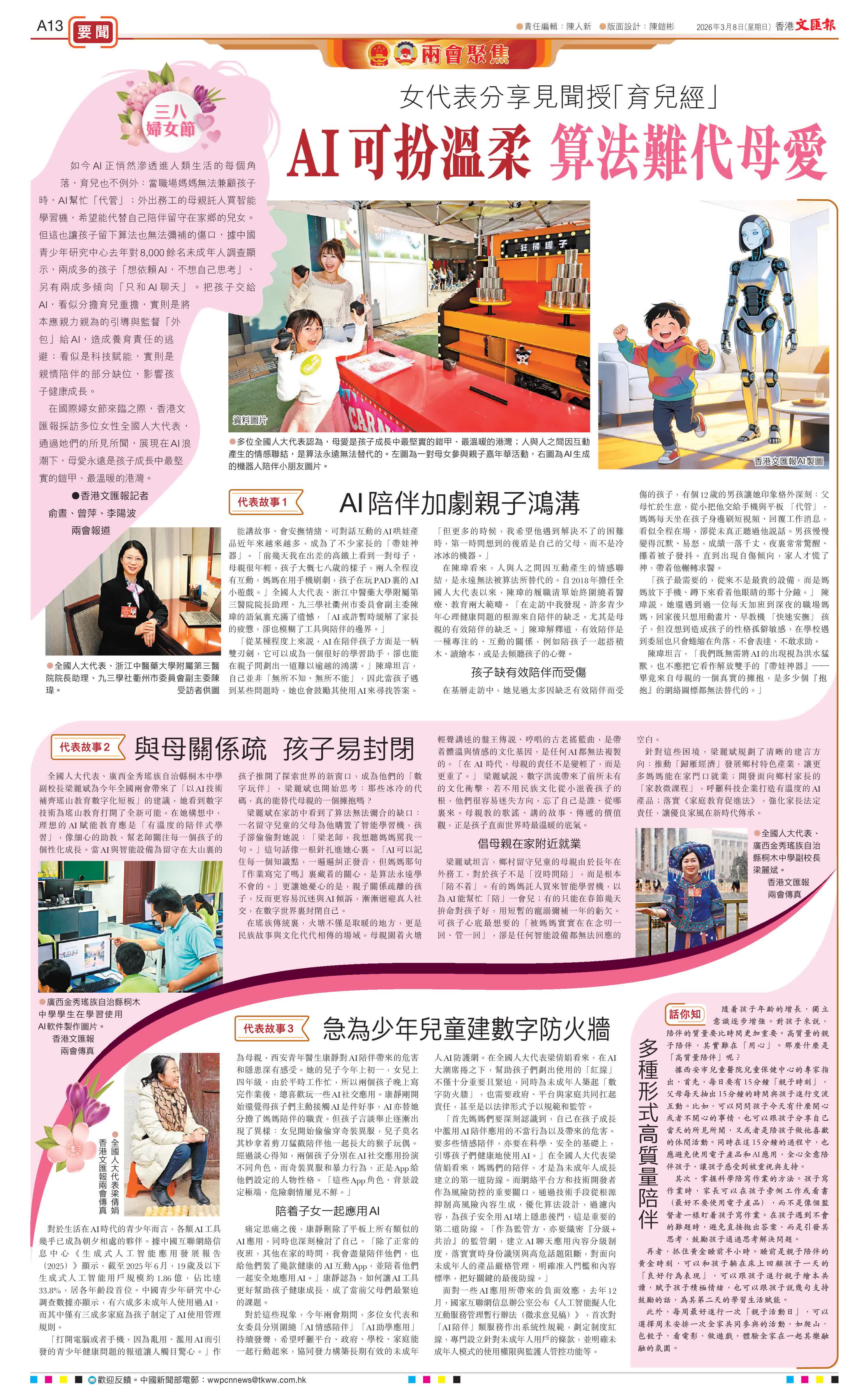 在國際婦女節來臨之際,香港文匯報採訪多位女性全國人大代表,通過她們的所見所聞,展現在AI浪潮下,母愛永遠是孩子成長中最堅實的鎧甲、最溫暖的港灣。