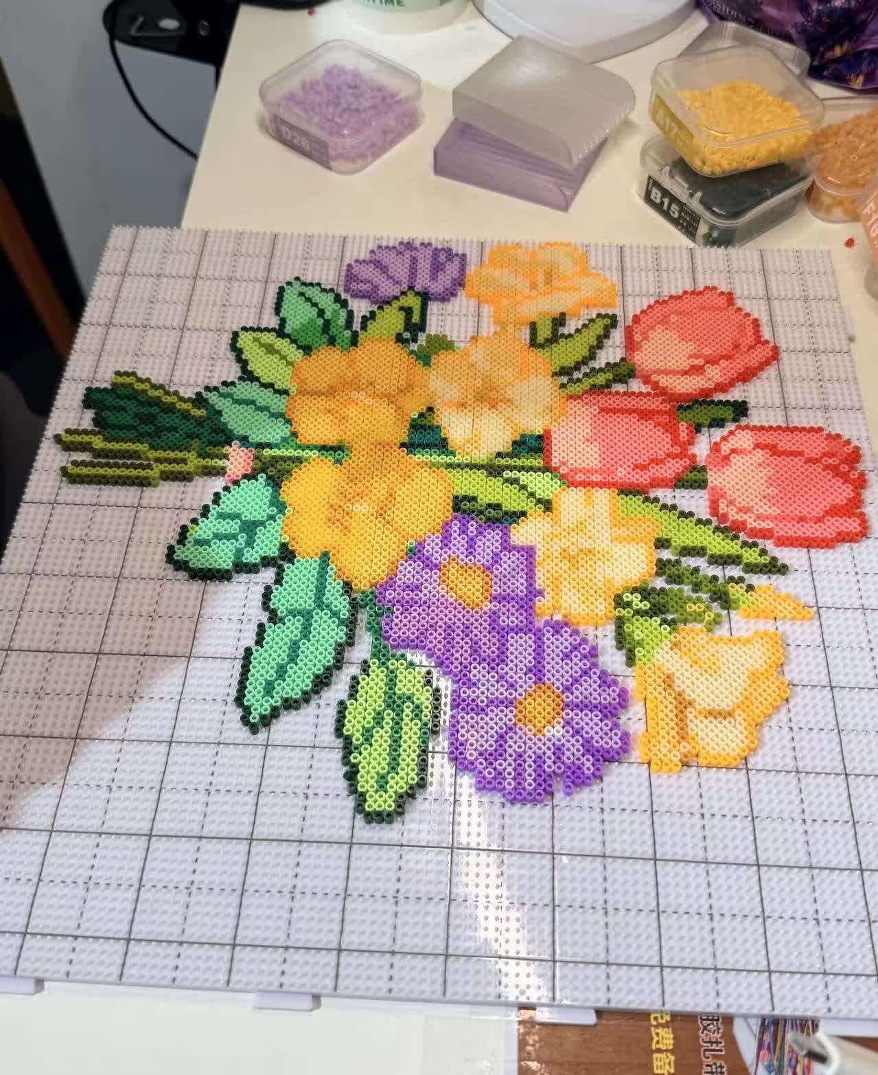 李然完成了她的拚豆花束,拍了張照片發在朋友圈。配文寫的是:「送給自己的一束花,祝自己節日快樂。每一顆豆都算數,每一步都作數。」