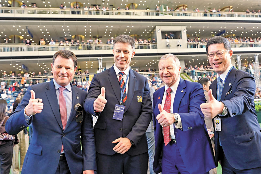 馬會行政總裁應家柏和馬會體育業務執行總監施永傑,昨陪同朗尼莊臣先到馬匹亮相圈,近距離觀看馬匹出賽前狀況,隨後於場邊一同欣賞賽事。熱愛賽馬和純種馬育馬工作的應家柏,亦熱衷於足球運動,並於大學畢業前參與德國職業足球賽事;而施永傑則曾擔任巴塞隆拿、曼聯、富咸和AC米蘭足球會的高級管理職位,難怪兩人與朗尼莊臣惺惺相惜。
