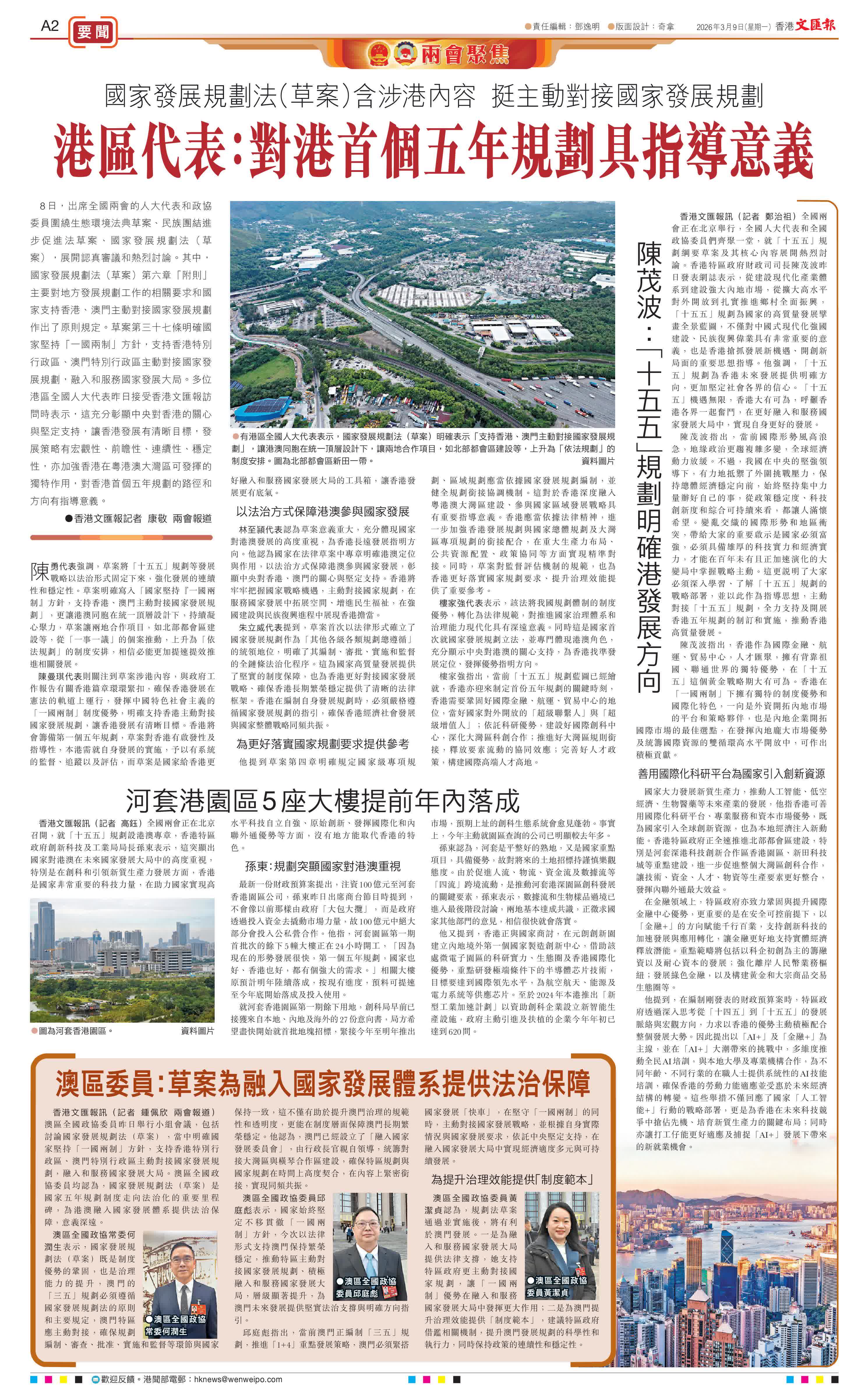 陳勇代表強調,草案將「十五五」規劃等發展戰略以法治形式固定下來,強化發展的連續性和穩定性。草案明確寫入「國家堅持『一國兩制』方針,支持香港、澳門主動對接國家發展規劃」,更讓港澳同胞在統一頂層設計下,持續凝心聚力,草案讓兩地合作項目,如北部都會區建設等,從「一事一議」的個案推動,上升為「依法規劃」的制度安排,相信必能更加提速提效推進相關發展。
