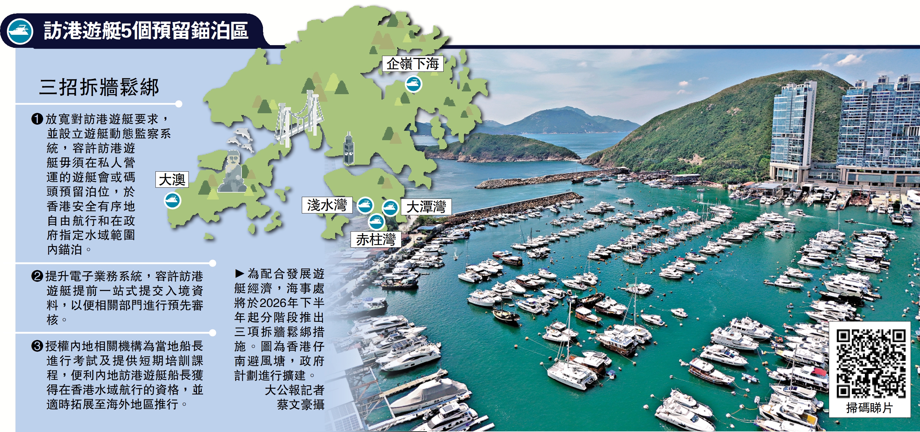 香港文匯報訊(記者 蕭景源)去年《施政報告》中提出布優化遊艇產業配套,推廣高端遊艇旅遊。根據現時法例規定,訪港遊艇在香港水域自由航行,需要提交在私人遊艇會或碼頭取得泊位的證明。政府為發展遊艇經濟將放寬規定,海事處上月提交離島區議會的文件,初步建議設立5個訪港遊艇錨泊區,分別為大潭灣、赤柱灣、企嶺下海、大澳及淺水灣,預計可停泊共115艘遊艇。