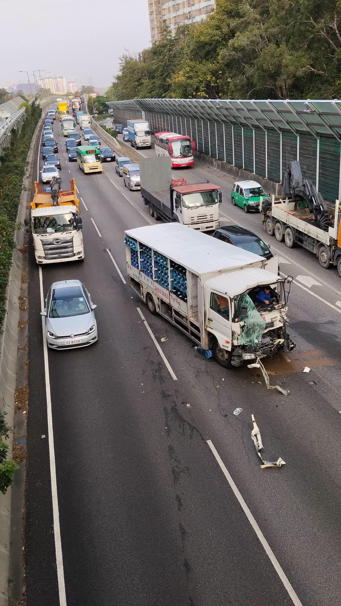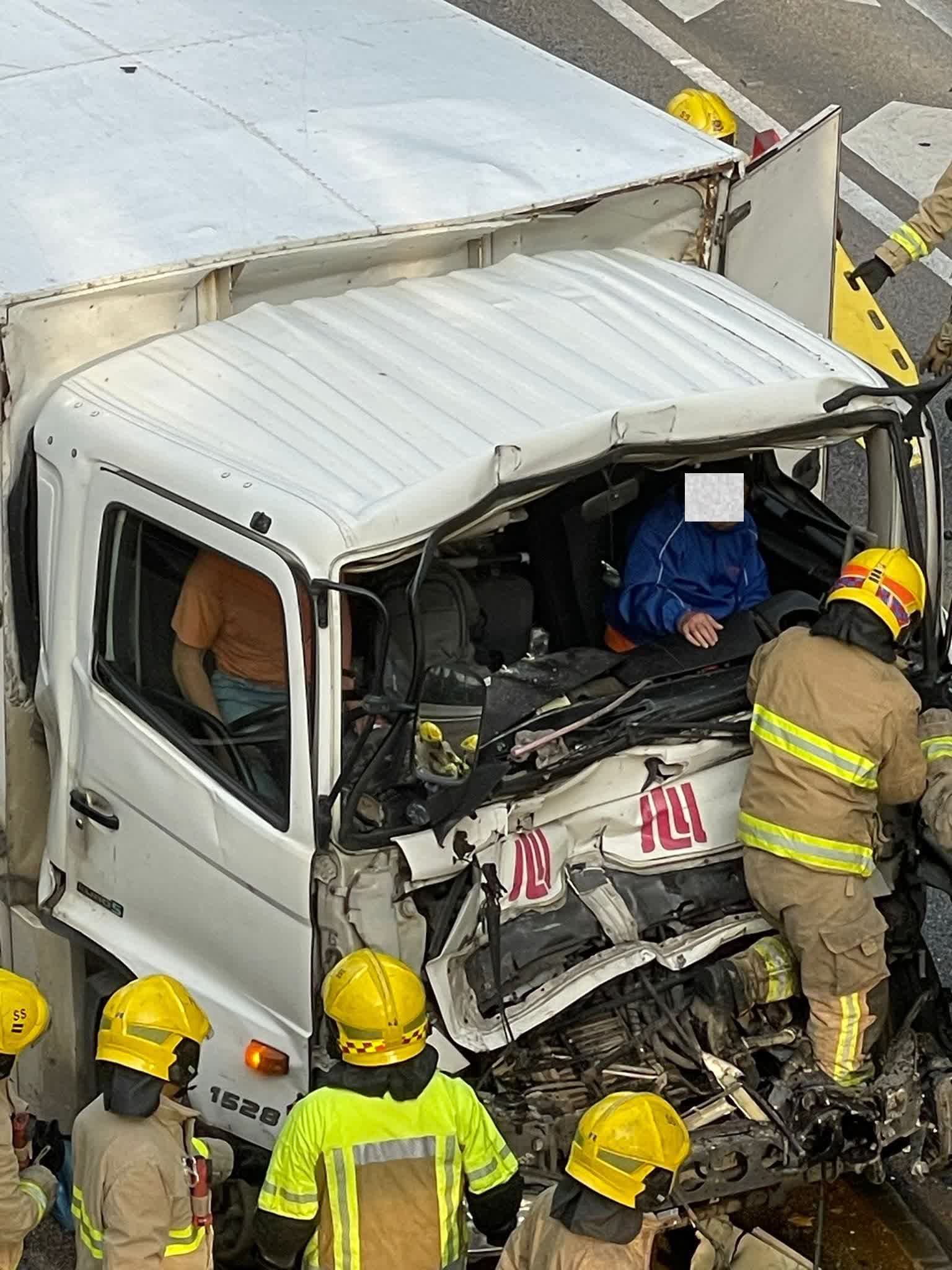 香港文匯報訊(記者 蕭景源)今日(9日)早上7時許,兩輛中型貨車沿粉嶺公路往大埔方向行駛途中,至近彩園邨對出發生相撞意外,其中一輛運送樽裝水貨車的車頭嚴重凹陷損毁,擋風玻璃碎裂脫落,零件散落一地,車上司機及乘客受傷被困。警員趕至封鎖現場,由消防員使用工具救出兩名被困傷者,傷者清醒由救護車送院治理;警方正調查交通意外原因。
