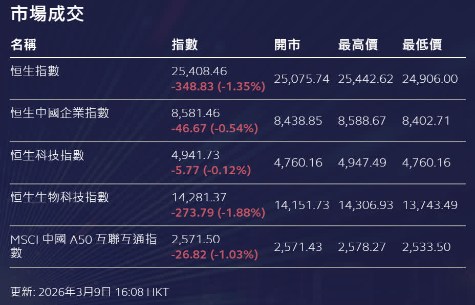 香港文匯報訊 地緣政治避險情緒持續高企,國際石油期貨持續飆升,亞太區股市周一普遍下挫,港股亦見回軟,三大指數齊低收。恒生指數(恒指)收報25,408點,全日跌348點或1.35%。國企指數跌0.54%;恒生科技指數跌0.12%,兩指數表現優於恒指。大市成交金額增至3,923.3億元,為2025年10月14日(當日成交約3,989.1億元)後以來最高。