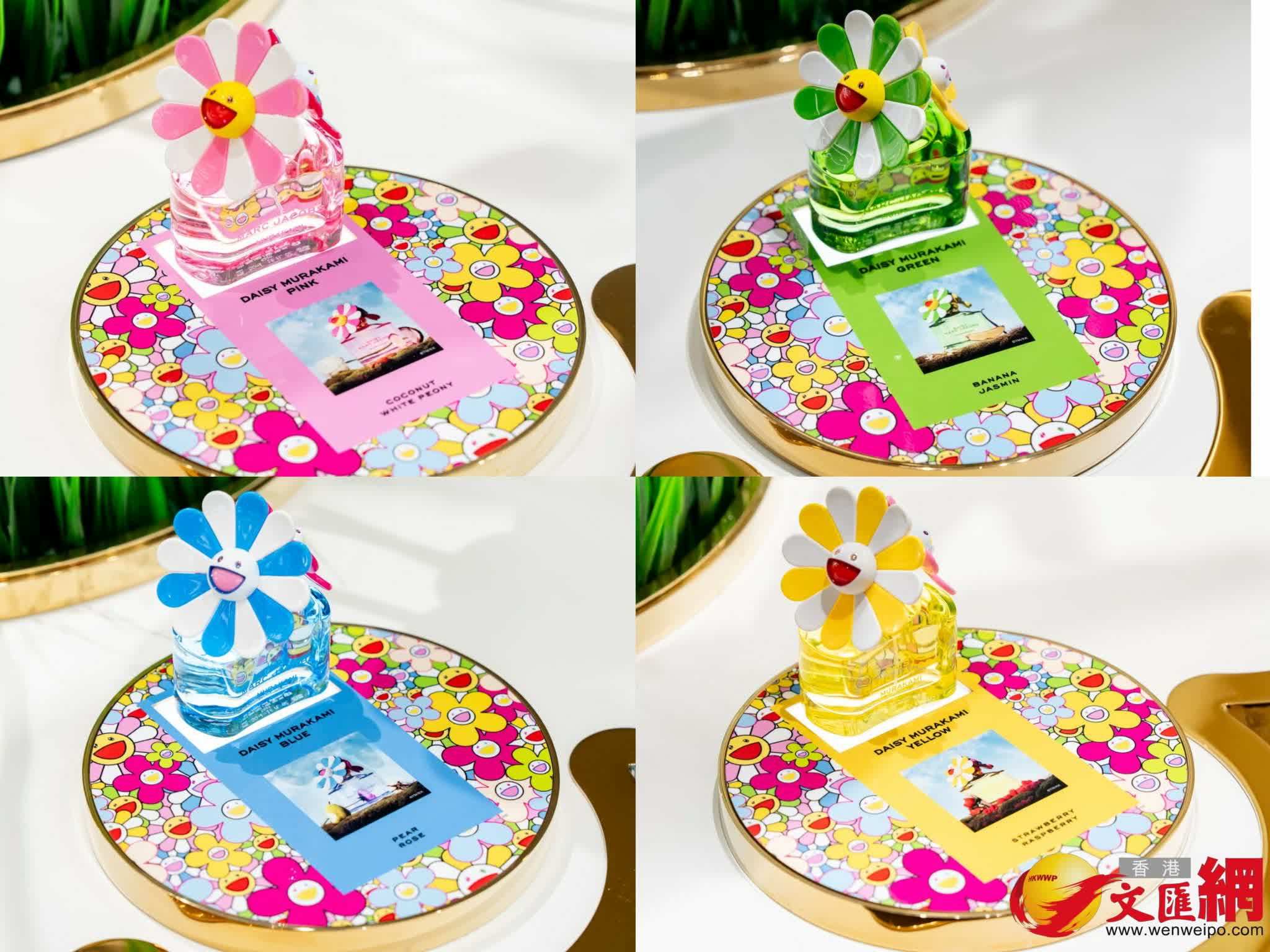 設計靈感源自品牌經典DAISY系列,為香水瓶披上黃色、粉紅色、綠色及藍色四款奪目新色,以明亮活潑的色彩映襯四款全新香水。標誌性的小雛菊瓶蓋亦融入村上隆的特色花朵圖案,令人眼前一亮。香水盒設計同樣惹人注目,巧妙結合村上隆一貫的玩味風格與豐富色彩。