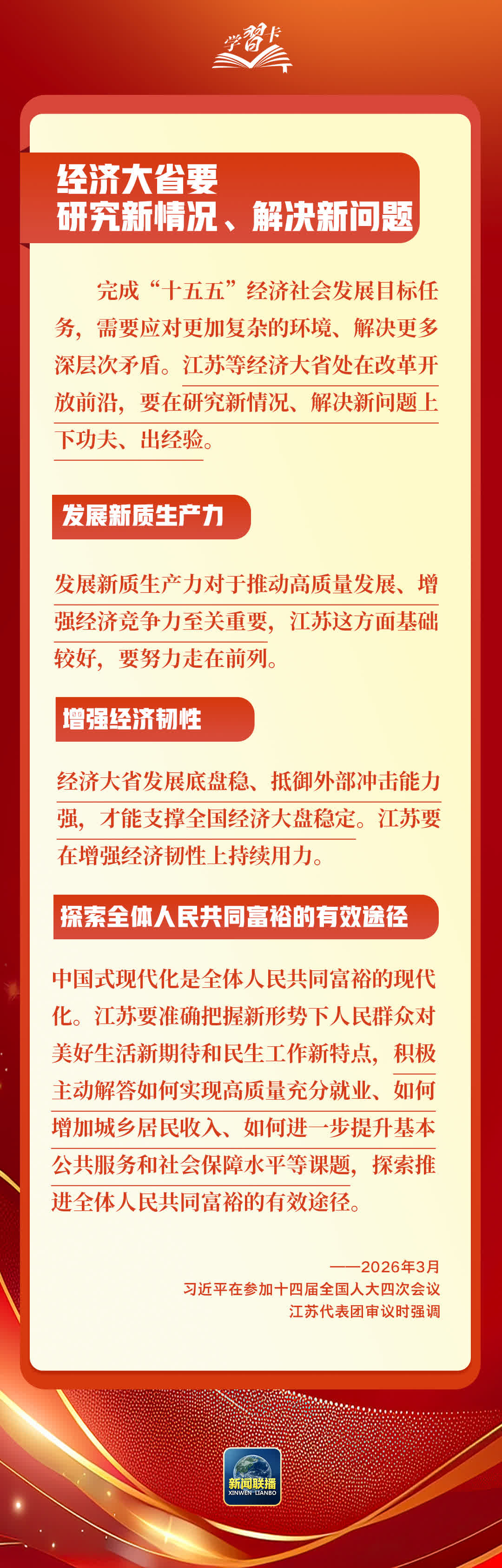 3月5日至7日,習近平總書記先後參加江蘇代表團審議、看望全國政協委員、出席解放軍和武警部隊代表團全體會議,圍繞經濟大省發展、健康中國建設、政治建軍等重大議題作出深刻闡釋、提出明確要求,為「十五五」開好局、起好步提供科學指引。