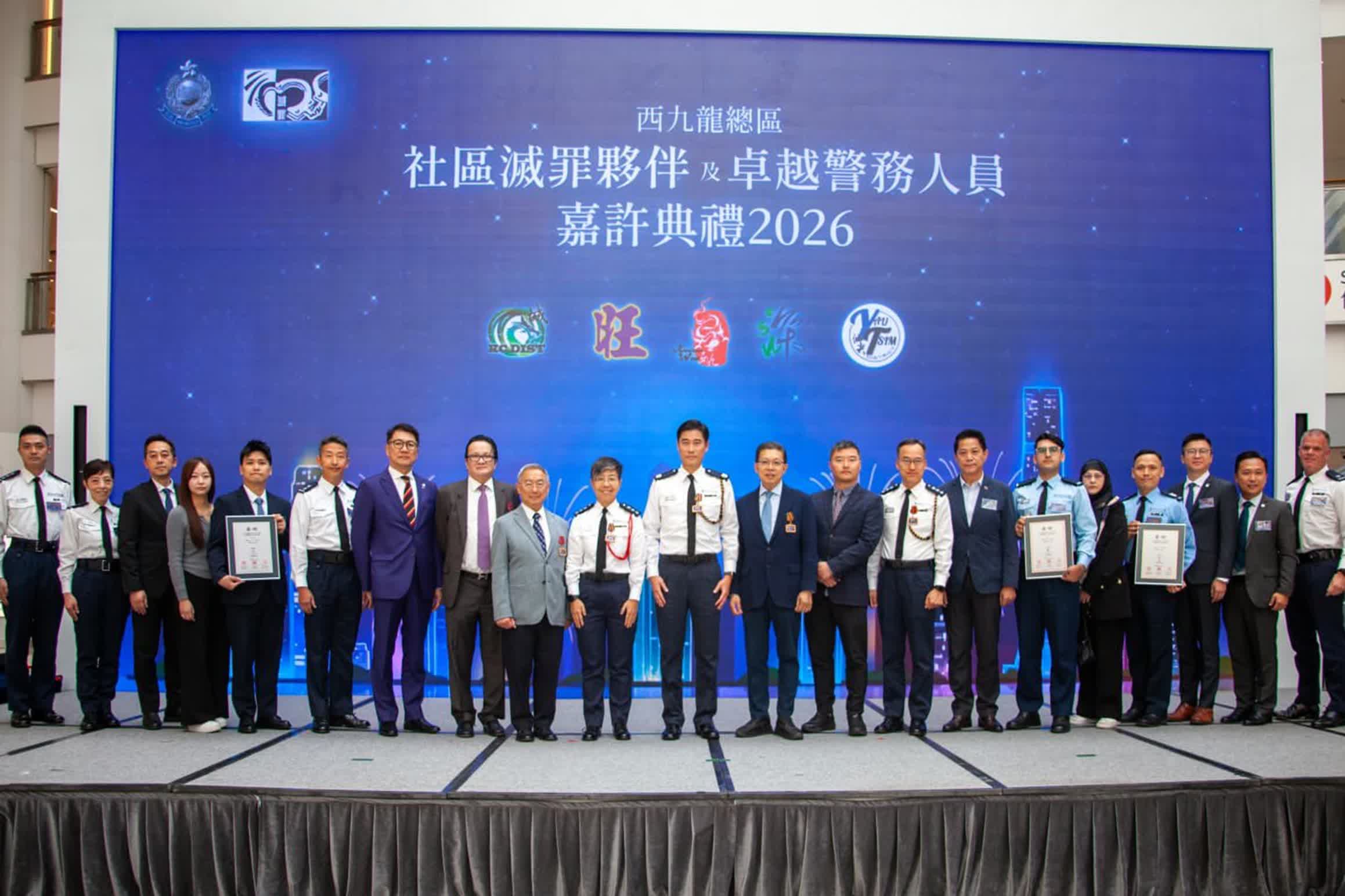 香港文匯報訊(記者 蕭景源)警民同心共建安全社區。西九龍總區指揮官吳樂俊助理處長,聯同油尖旺、深水埗、九龍城三區撲滅罪行委員會主席,以及各警區指揮官,今日(9日)一同主禮「西九龍總區社區滅罪夥伴及卓越警務人員嘉許典禮2026」,向過去一年與警方並肩作戰的社區夥伴頒發感謝狀,同時嘉獎表現卓越的同事。