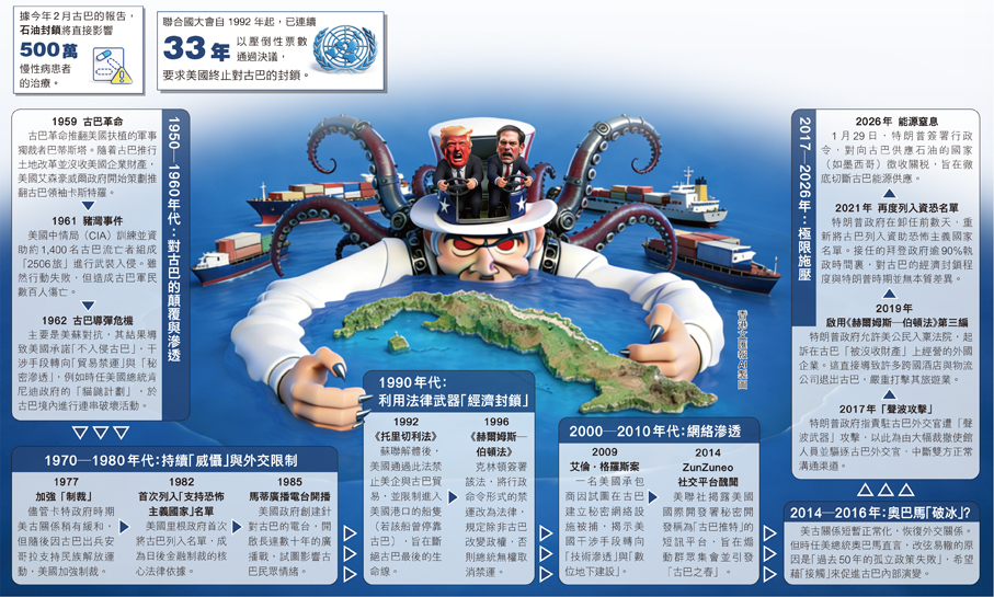 古巴是美國濫施脅迫外交的「重災區」。1962年,美國開始對古巴實施經濟、商業和金融封鎖並持續至今。美國透過多種干涉手段試圖顛覆古巴政府,並隨技術進步演進,演變成如今的「混合戰」;包括物理層面:炸彈、暗殺、武裝入侵(1960年代)。法律層面:通過國內法干涉國際貿易(1990年代至今)。數位層面:建立地下網絡、社媒煽動(2010年代至今)。金融層面:利用全球美元霸權進行精準封鎖(2020年代)。