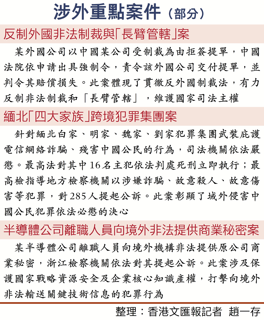 在服務高水平對外開放方面,這份報告還指出,組織北京、上海、重慶等地檢察機關保障自由貿易試驗區、服務業擴大開放綜合示範區等建設。協同加強反制裁、反干預、反「長臂管轄」鬥爭。加強海外利益司法保護,依法維護中國公民、企業合法權益。