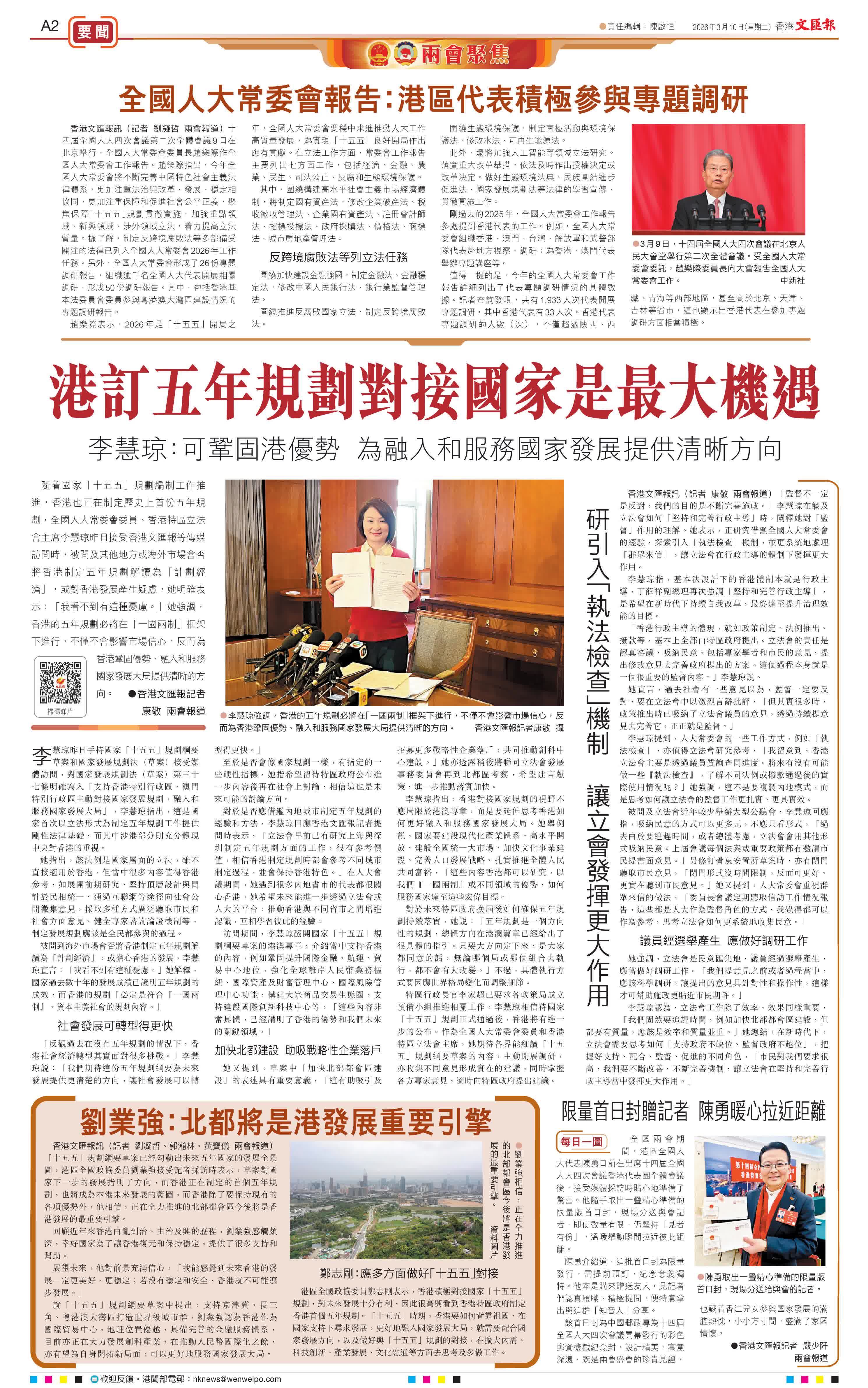 李慧琼昨日手持國家「十五五」規劃綱要草案和國家發展規劃法(草案)接受媒體訪問,對國家發展規劃法(草案)第三十七條明確寫入「支持香港特別行政區、澳門特別行政區主動對接國家發展規劃,融入和服務國家發展大局」,李慧琼指出,這是國家首次以立法形式為制定五年規劃工作提供剛性法律基礎,而其中涉港部分則充分體現中央對香港的重視。