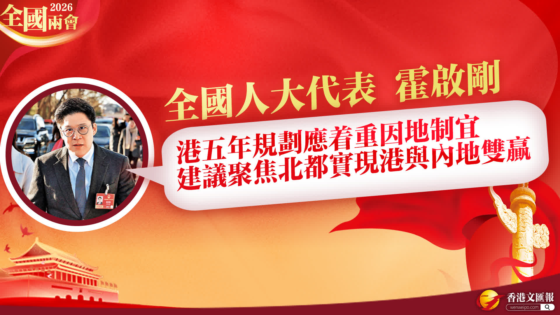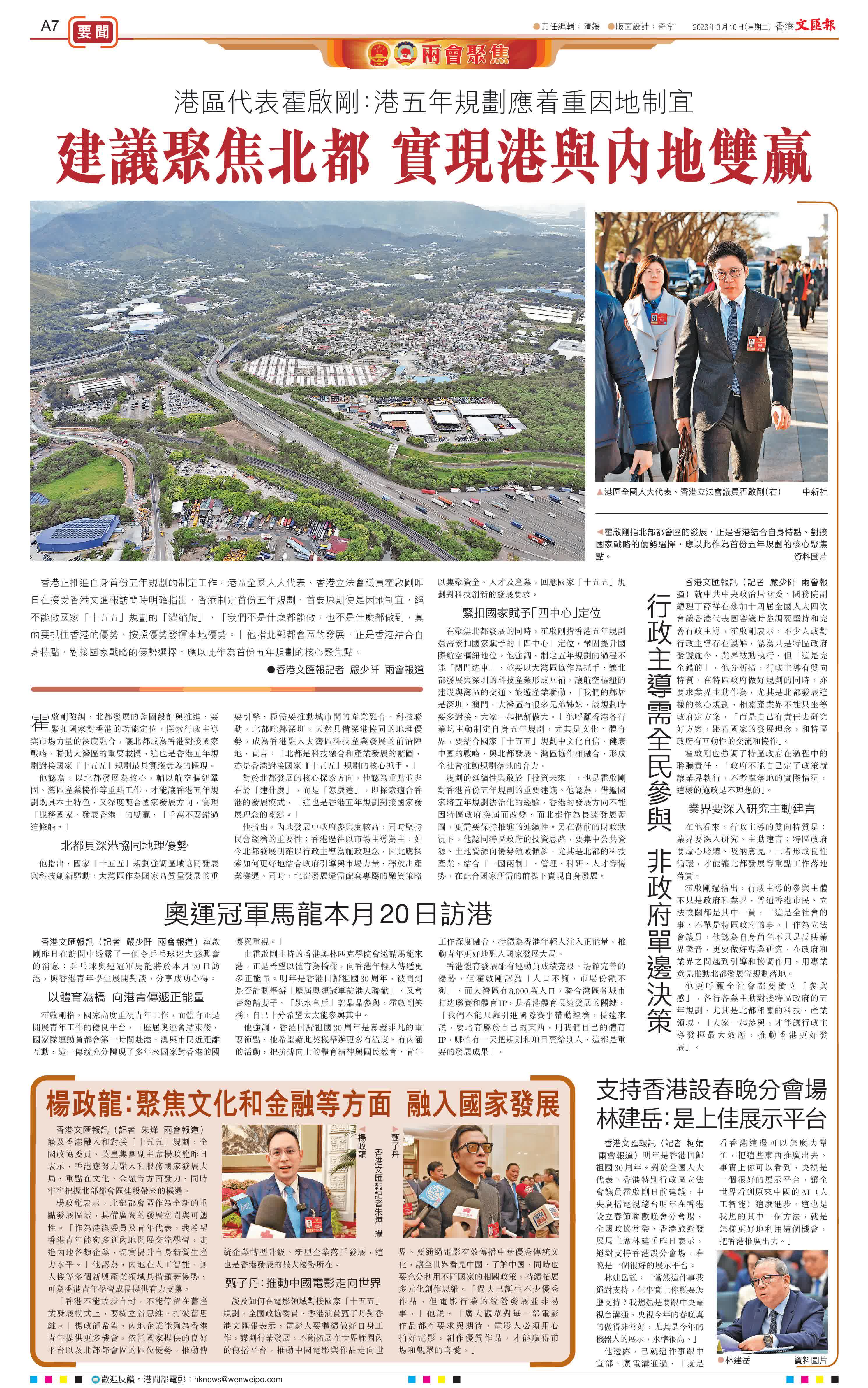 (香港文匯報記者 嚴少阡 兩會報道)香港正推進自身首份五年規劃的制定工作。港區全國人大代表、香港立法會議員霍啟剛昨日在接受香港文匯報訪問時明確指出,香港制定首份五年規劃,首要原則便是因地制宜,絕不能做國家「十五五」規劃的「濃縮版」,「我們不是什麼都能做,也不是什麼都做到,真的要抓住香港的優勢,按照優勢發揮本地優勢。」他指北部都會區的發展,正是香港結合自身特點、對接國家戰略的優勢選擇,應以此作為首份五年規劃的核心聚焦點。