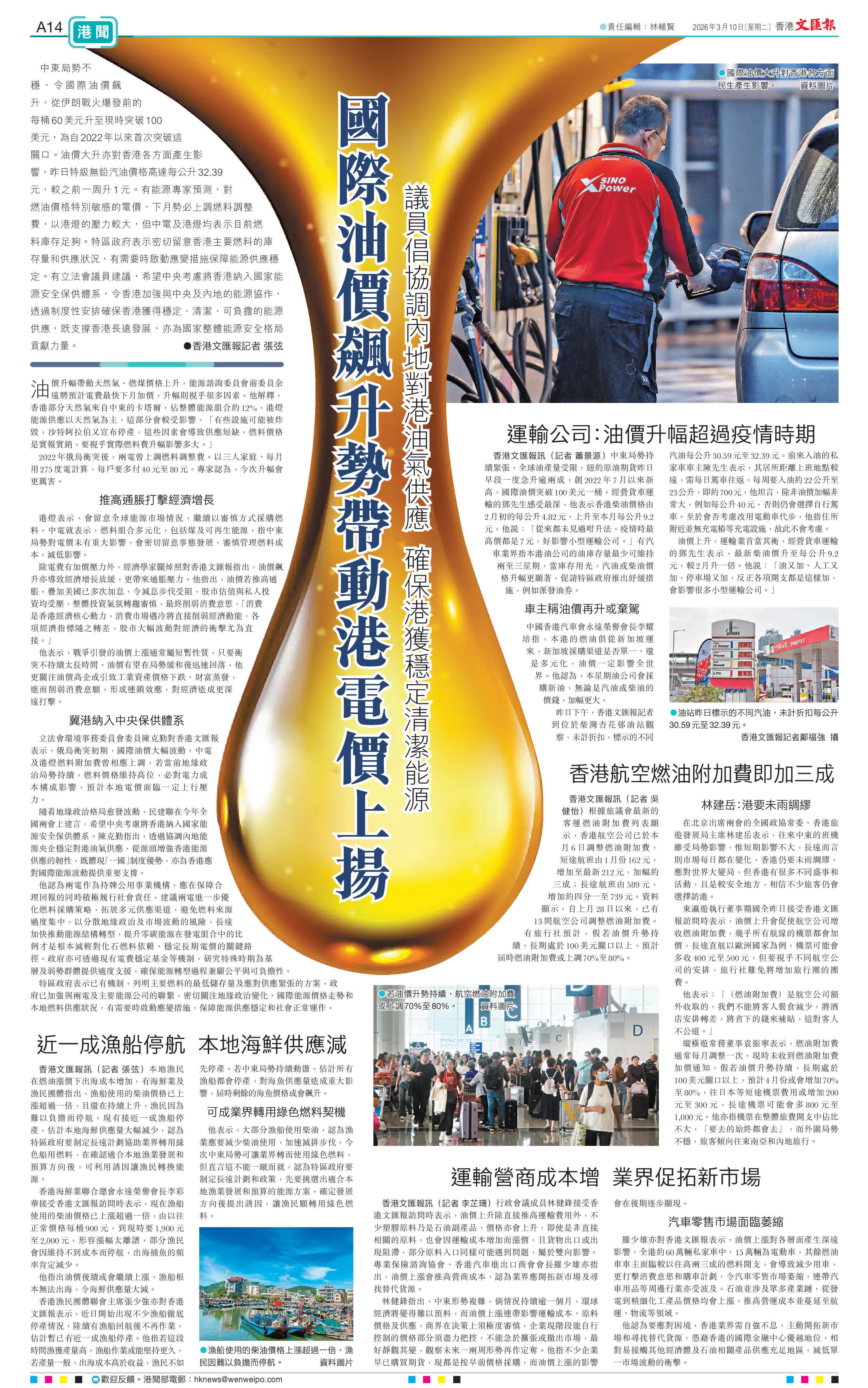 (香港文匯報記者 張弦)中東局勢不穩,令國際油價飆升,從伊朗戰火爆發前的每桶60美元升至現時突破100美元,為自2022年以來首次突破這關口。油價大升亦對香港各方面產生影響,昨日特級無鉛汽油價格高達每公升32.39元,較之前一周升1元。有能源專家預測,對燃油價格特別敏感的電價,下月勢必上調燃料調整費,以港燈的壓力較大,但中電及港燈均表示目前燃料庫存足夠。特區政府表示密切留意香港主要燃料的庫存量和供應狀況,有需要時啟動應變措施保障能源供應穩定。有立法會議員建議,希望中央考慮將香港納入國家能源安全保供體系,令香港加強與中央及內地的能源協作,透過制度性安排確保香港獲得穩定、清潔、可負擔的能源供應,既支撐香港長遠發展,亦為國家整體能源安全格局貢獻力量。