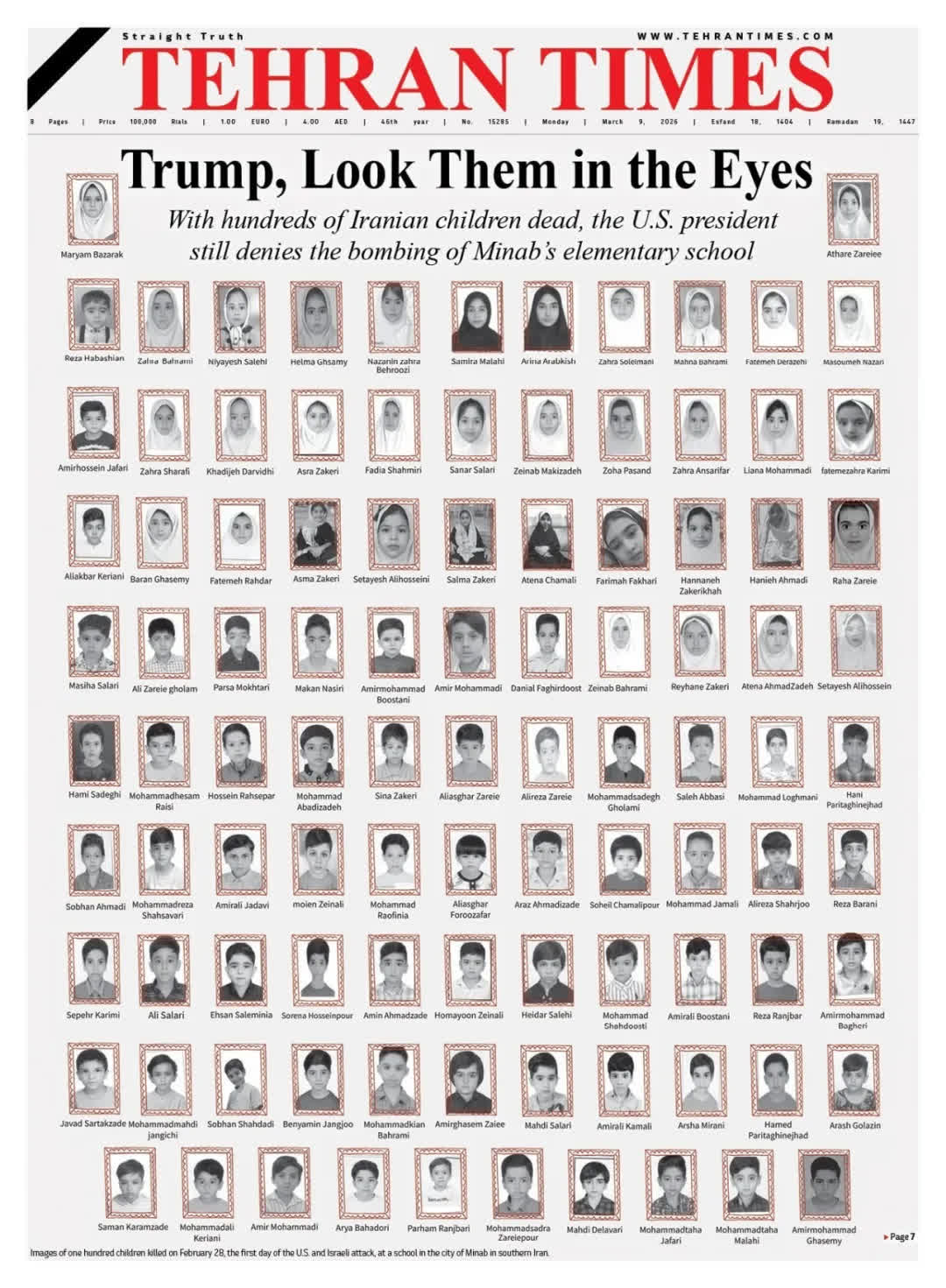 伊朗《德黑蘭時報》9日在頭版刊發題為《特朗普,請注視他們的眼睛》的文章,配圖為伊朗南部米納卜市一所小學受害兒童的遺照,譴責美國和以色列對伊朗發動聯合軍事打擊所造成的人道主義災難。