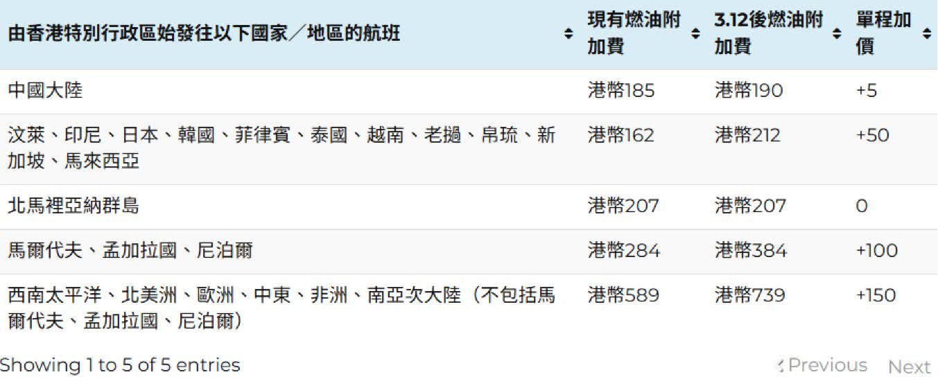 根據旅議會最新的客運燃油附加費列表顯示,香港航空公司在3月6日調整燃油附加費,短途航班由1月份162元,增加50元至最新212元,加幅約三成;長途航班由589元,增加150元至739元,加幅約25%。自上月28日以來,已有13間航空公司調整燃油附加費。