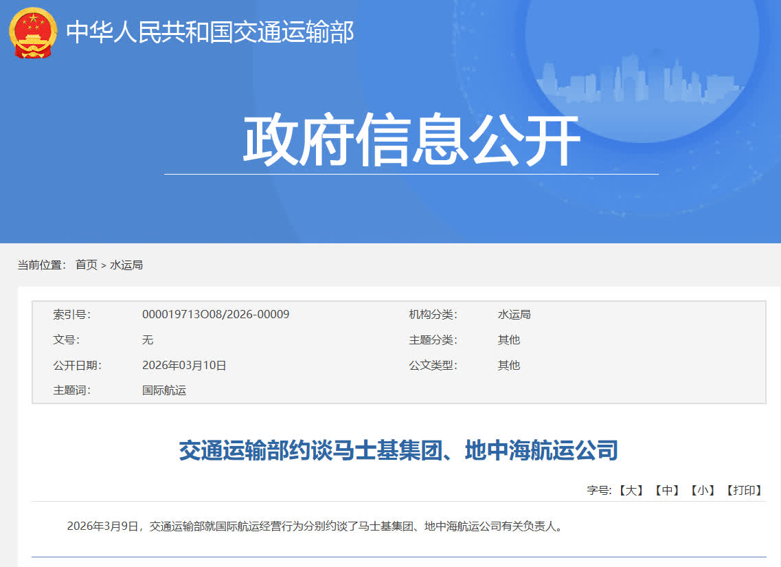 2026年3月9日,交通運輸部就國際航運經營行為分別約談了馬士基集團、地中海航運公司有關負責人。