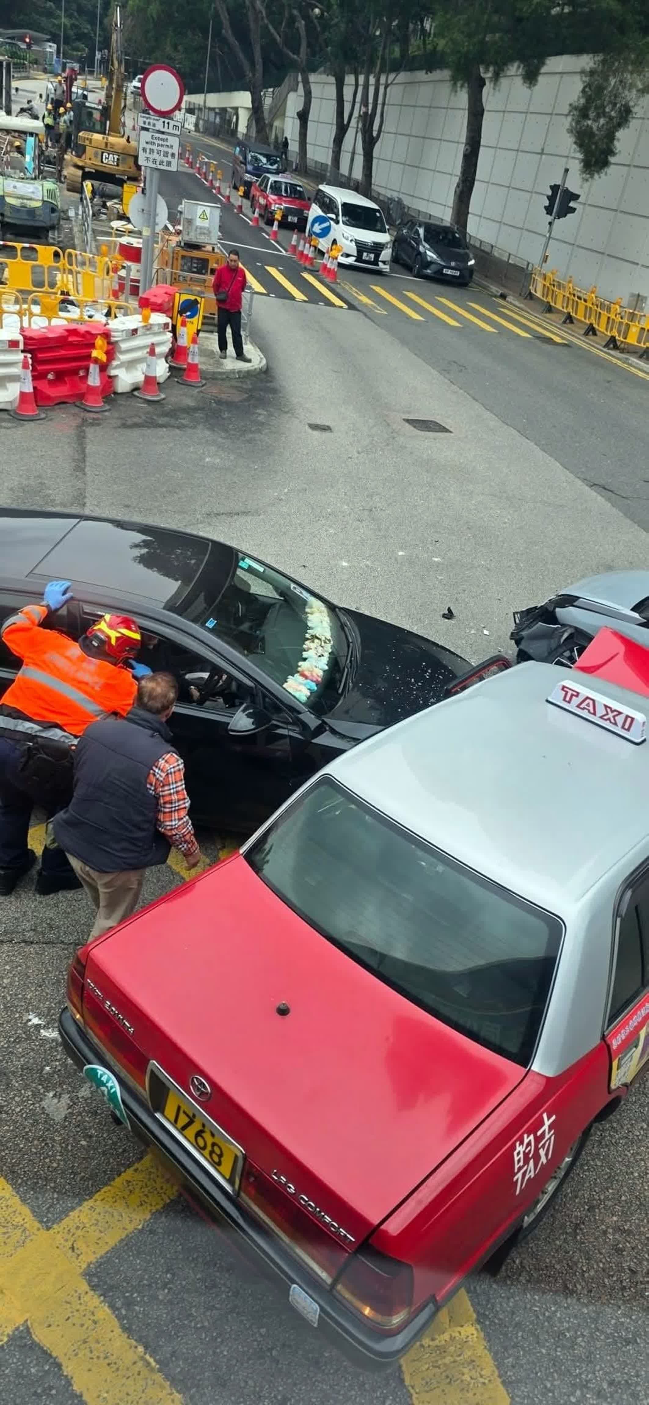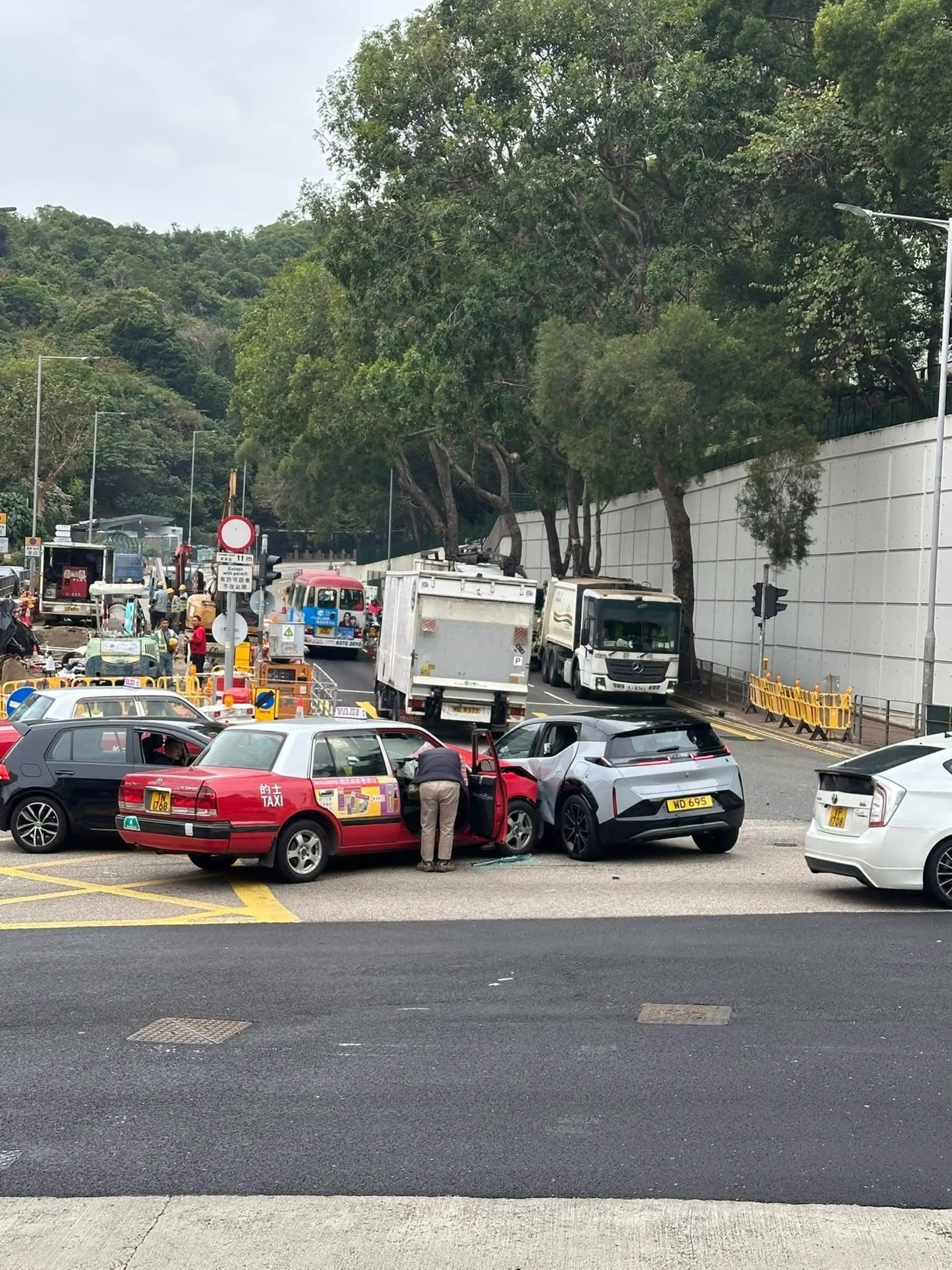 由網上片段可見,失事的士車頭及左邊車身損毀,其中一輛私家車損毀較嚴重,左邊車身凹陷,左後方車窗爆裂,玻璃碎滿地。受意外影響,現場交通一度阻。警員正調查意外原因。