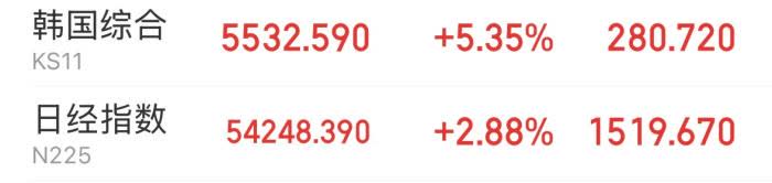 其中,日經225指數收盤上漲2.88%,報54248.39點;韓國綜合股價指數(KOSPI)表現更為強勁,收盤暴漲5.35%,報5532.59點,盤中一度上漲超6.5%,觸發熔斷機制,顯示出市場情緒的強烈回暖。