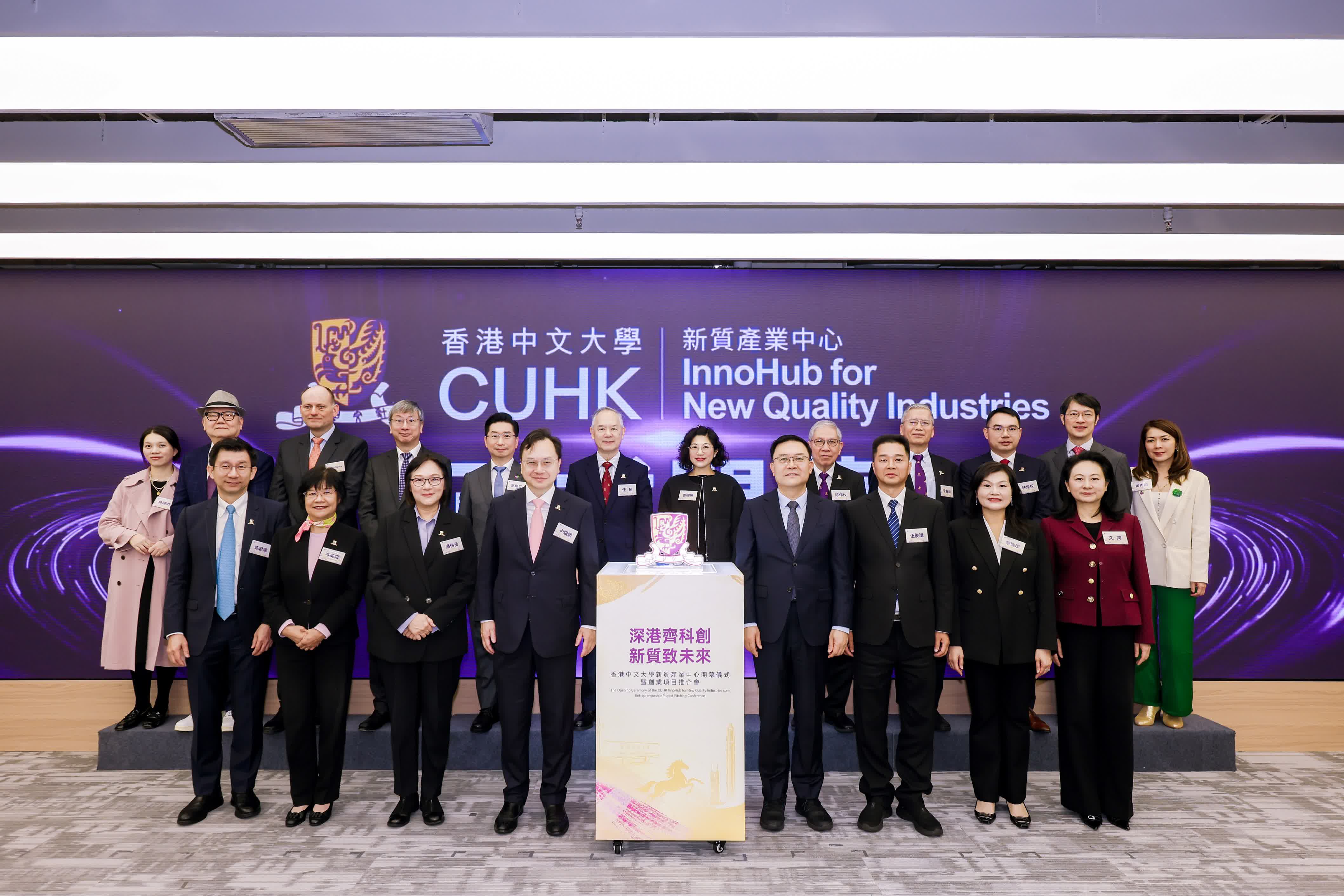 出席開幕儀式的嘉賓包括中大校長盧煜明、深圳市委常委、前海合作區黨工委書記王守睿、中央人民政府駐香港特別行政區聯絡辦公室深圳聯絡部副主任伍俊斌、前海管理局副局長文娉、香港特別行政區政府駐深圳聯絡處主任黎瑞瓊、中大常務副校長潘偉賢、副校長(研究)岑美霞、協理副校長(知識轉移)陳君賜、協理副校長(傳訊及公共關係)曾幗屏、深圳研究院院領導、新質產業中心管理團隊以及來自政府、媒體、合作機構、兄弟院校、校友組織以及大學各院系、相關部門的各位領導和嘉賓逾200人參加。