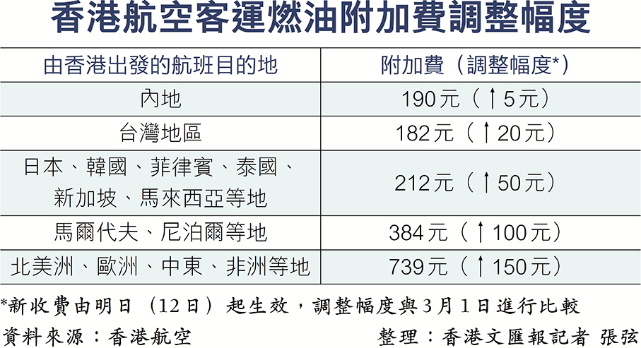 香港文匯報訊(記者 張弦)中東局勢不穩,令國際油價飆升,已對香港各方面產生不同影響。香港航空宣布明日(12日)起調整客運燃油附加費,前往中東、歐美等長途航班附加費上調至739元,每程多150元;前往日、韓、泰國等短途航班的燃油附加費加50元,達至212元,增幅達三成。